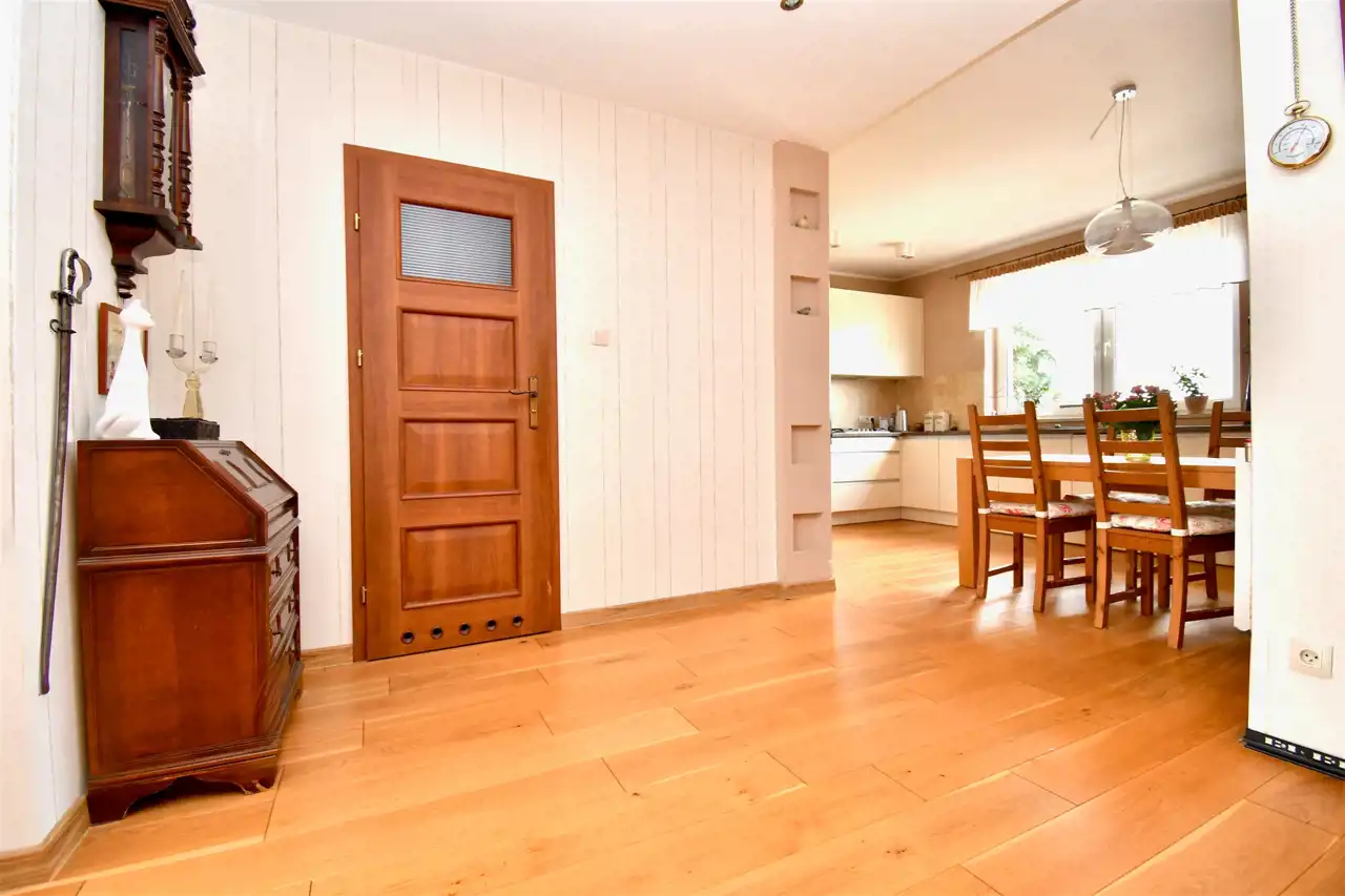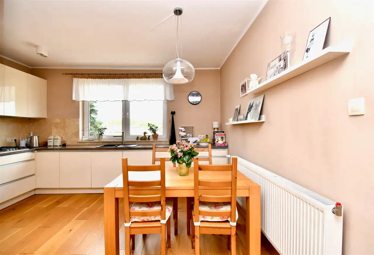 Pokój gościnny oraz duża kuchnia z jadalnią znajdują się od strony północnej, co zapewnia przyjemny chłód w upalne dni i stabilne światło do pracy czy gotowania.