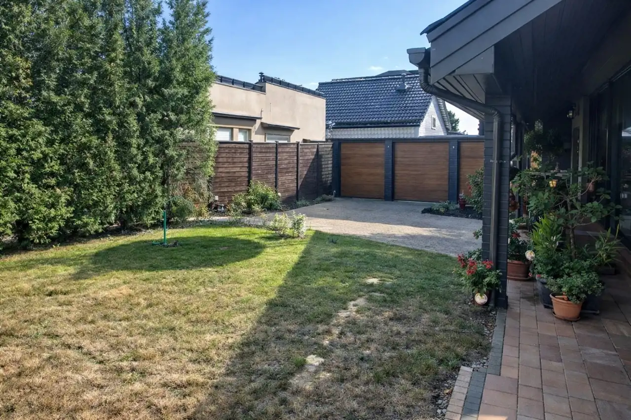 Na posesji znajduje się również wolnostojący, dwustanowiskowy garaż. Teren jest ogrodzony drewnianym płotem, a ogród wyposażono w system automatycznego nawodnienia. Dodatkowe bezpieczeństwo zapewnia monitoring oraz system alarmowy.