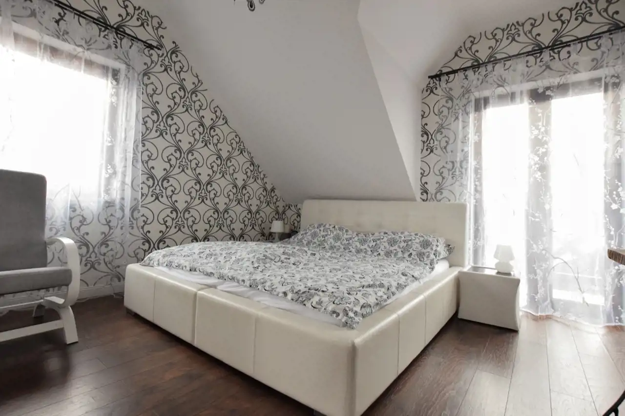 Piętro: trzy sypialnie, łazienka z wc, wyjście na strych