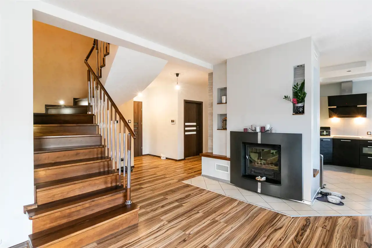 Salon z kominkiem - podłączony do instalacji grzewczej.