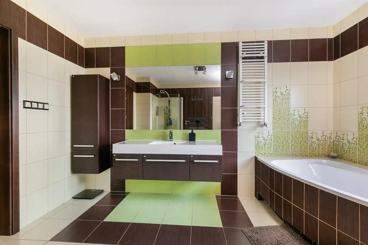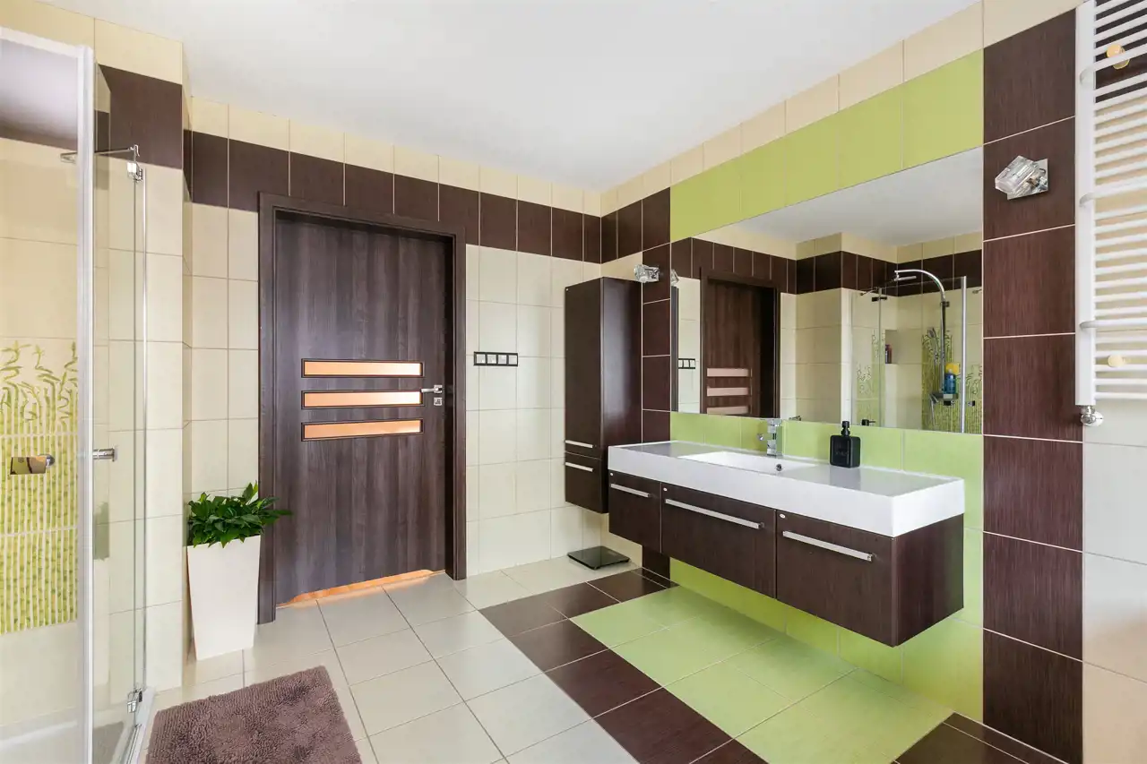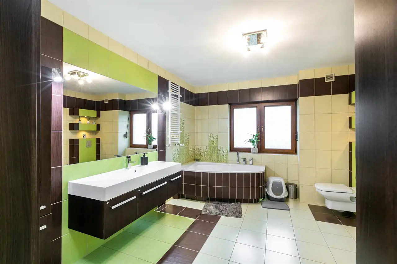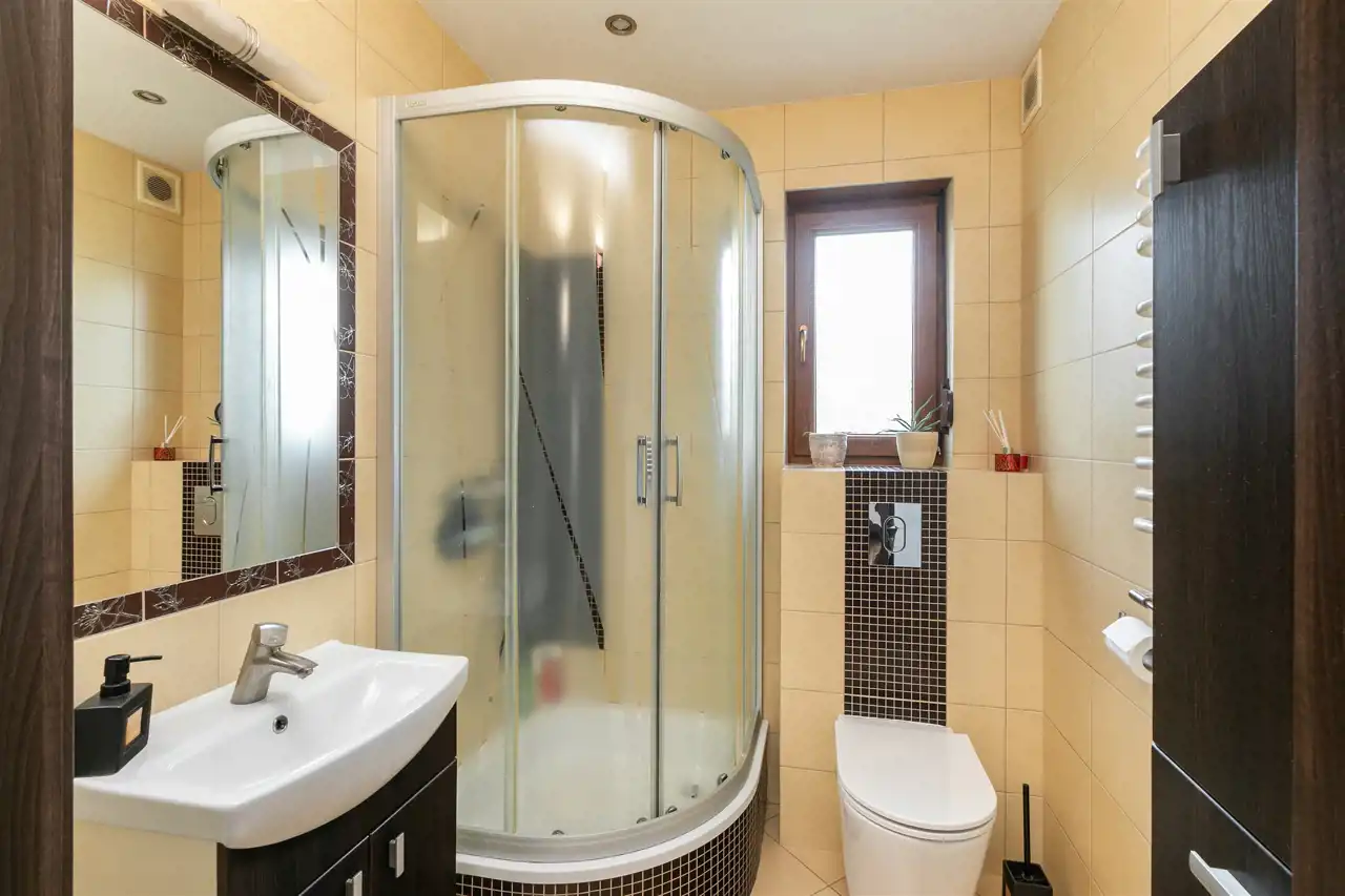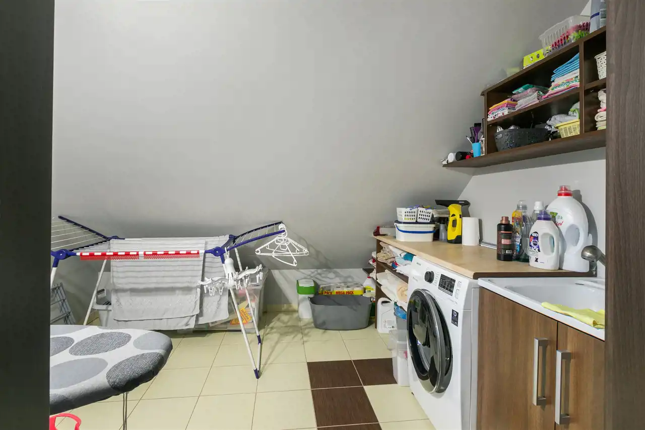 Pokój kąpielowy z wanną i kabiną prysznicową, oraz duża pralnia.