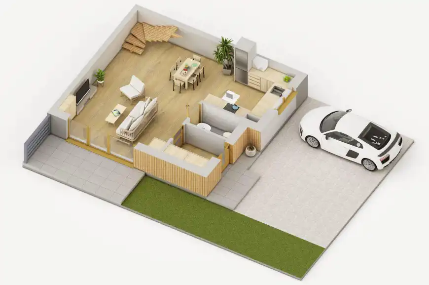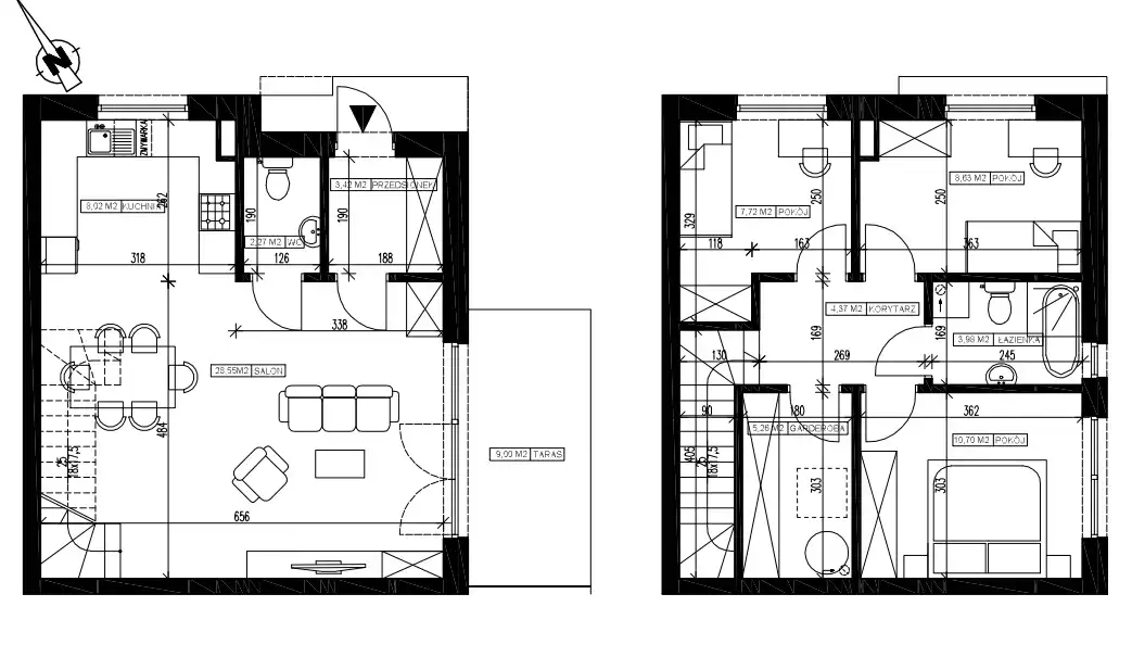 Parter: przestronny salon z aneksem kuchennym oraz wyjściem na duży taras, przedsionek, łazienka.