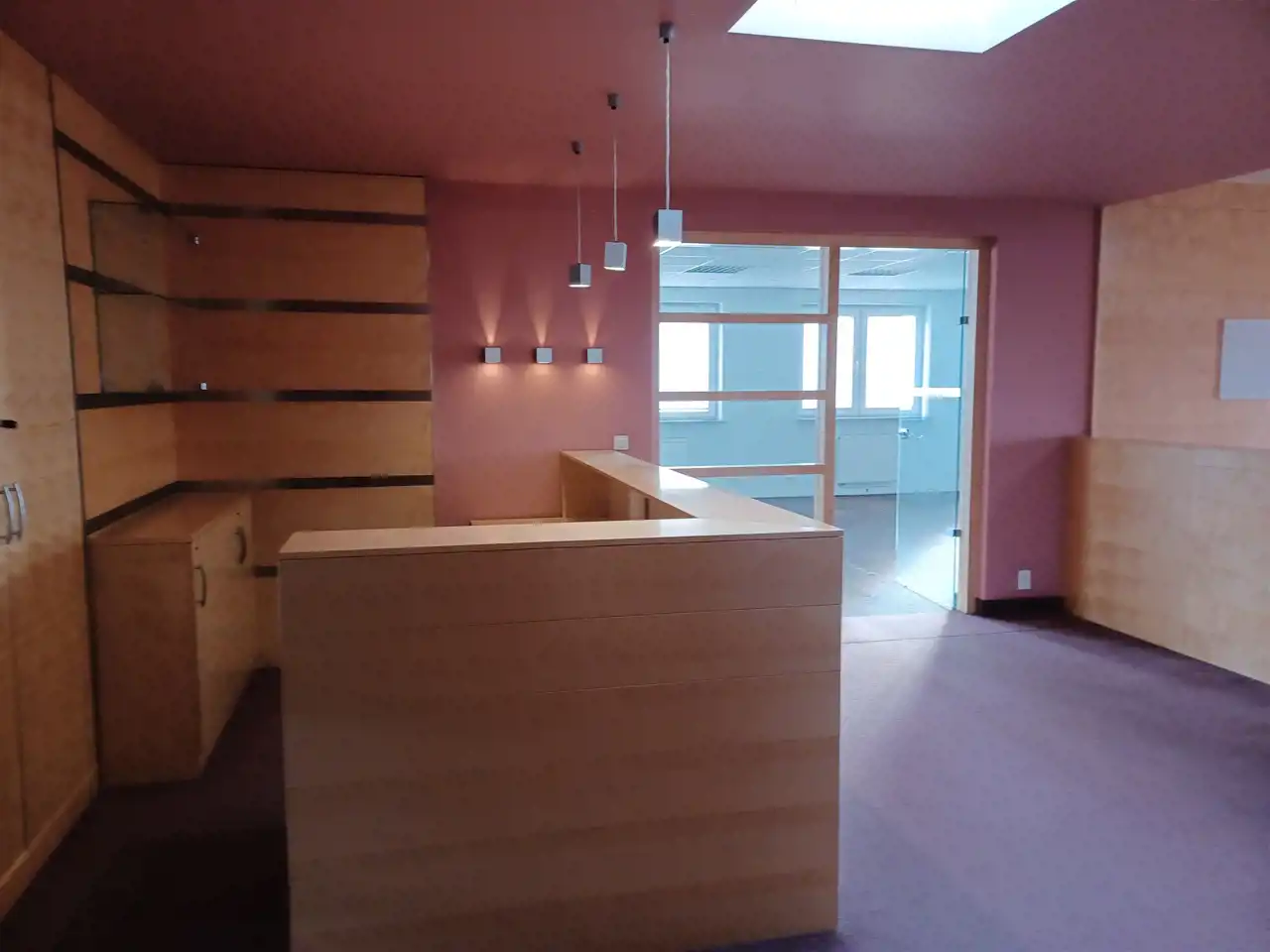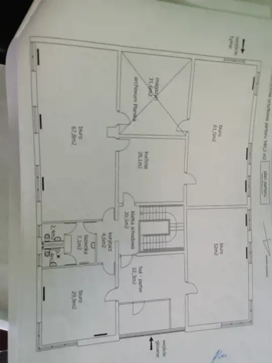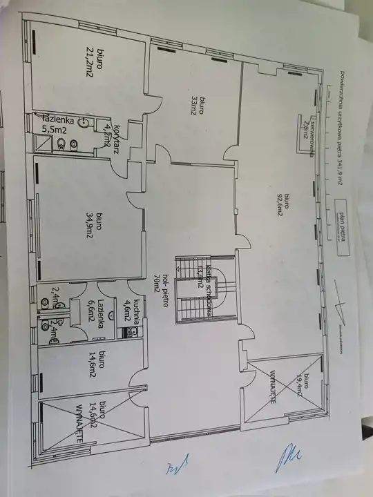 Duża (70 m2) otwarta przestrzeń z recepcją, pięć biur o powierzchni od 15- 93m2, mała kuchnia/aneks ok. 5m2 oraz łazienka 14,4 m2, razem 340 m2