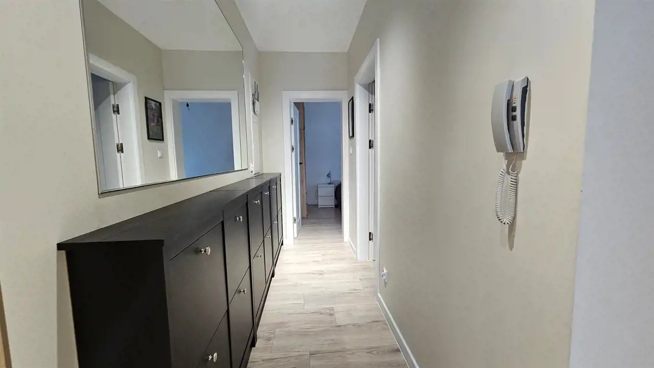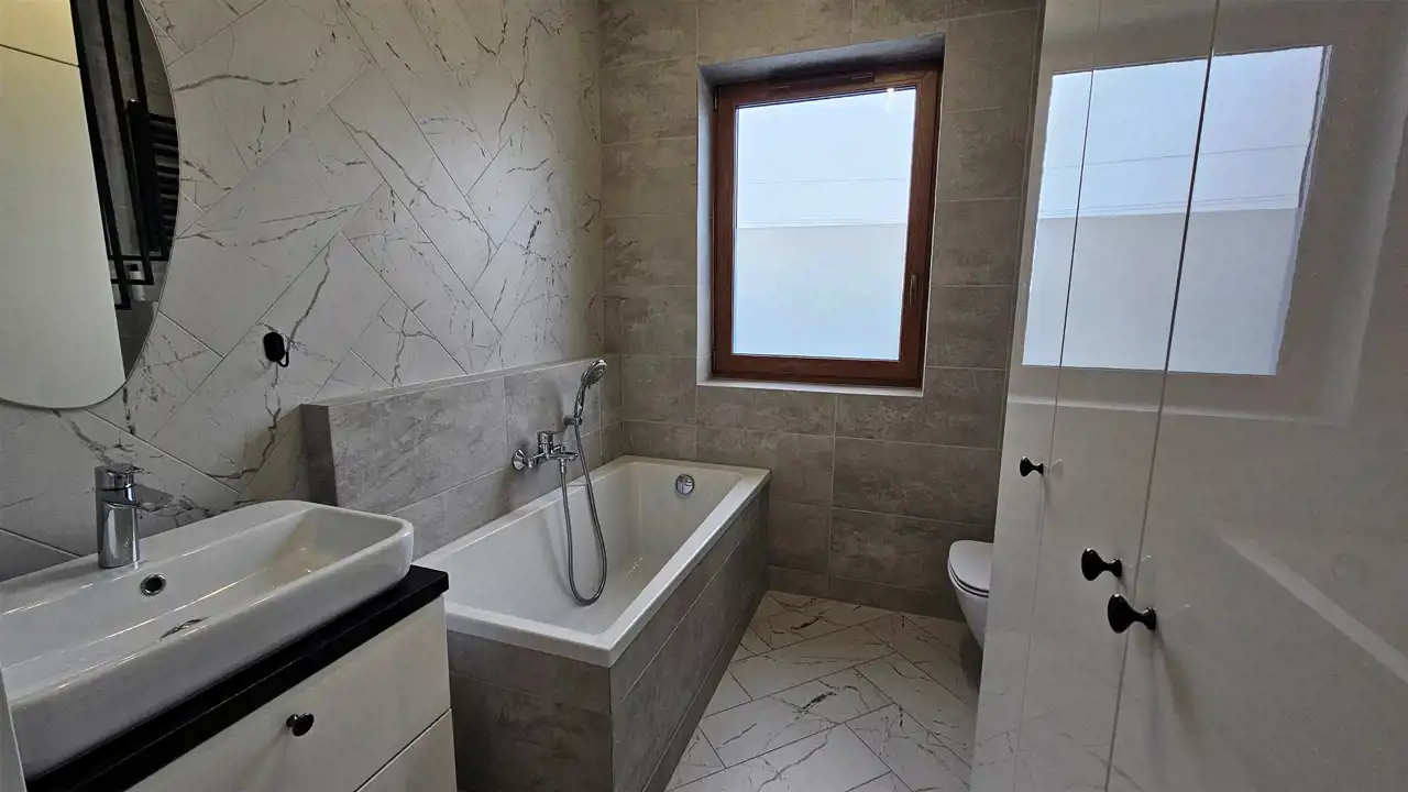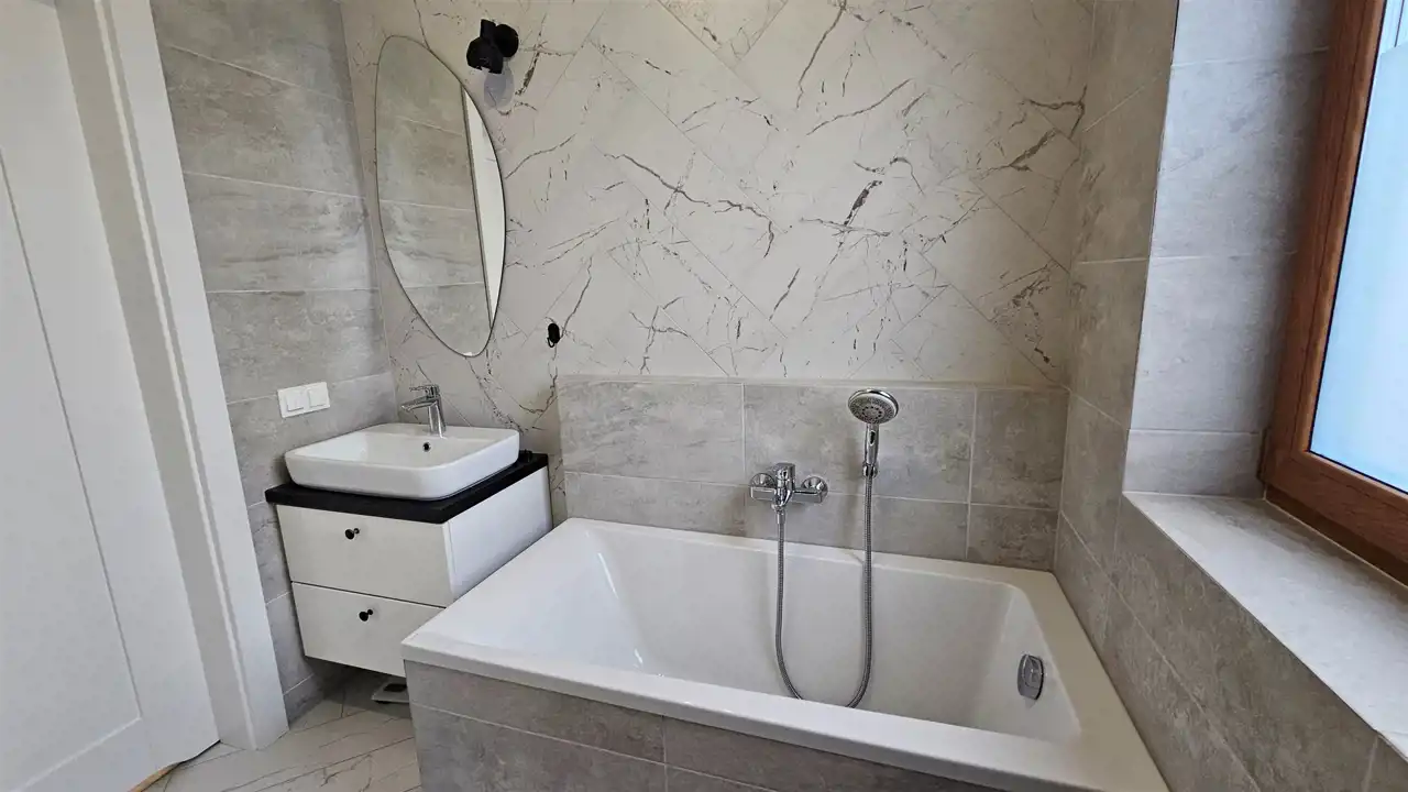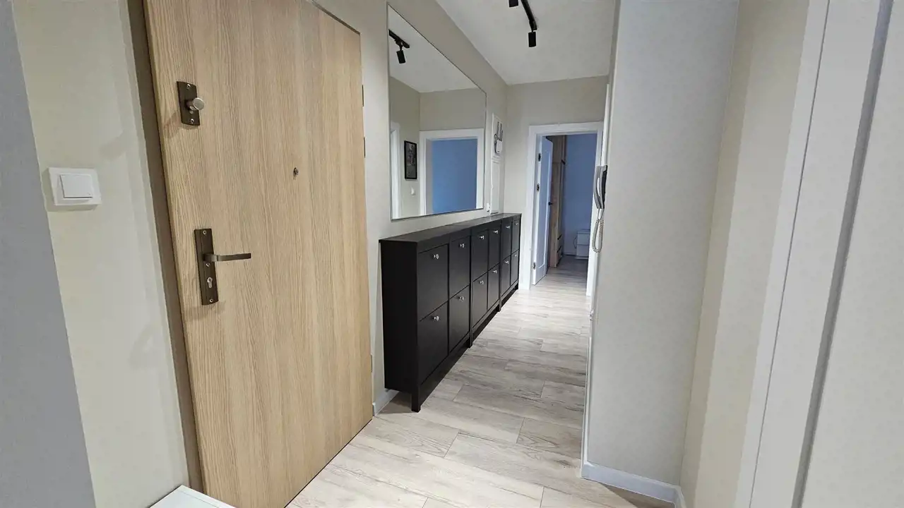 Wnętrze jest w pełni umeblowane i wyposażone, wykończone w wysokim standardzie – prezentuje się jak nowe, gotowe do zamieszkania bez dodatkowych nakładów.