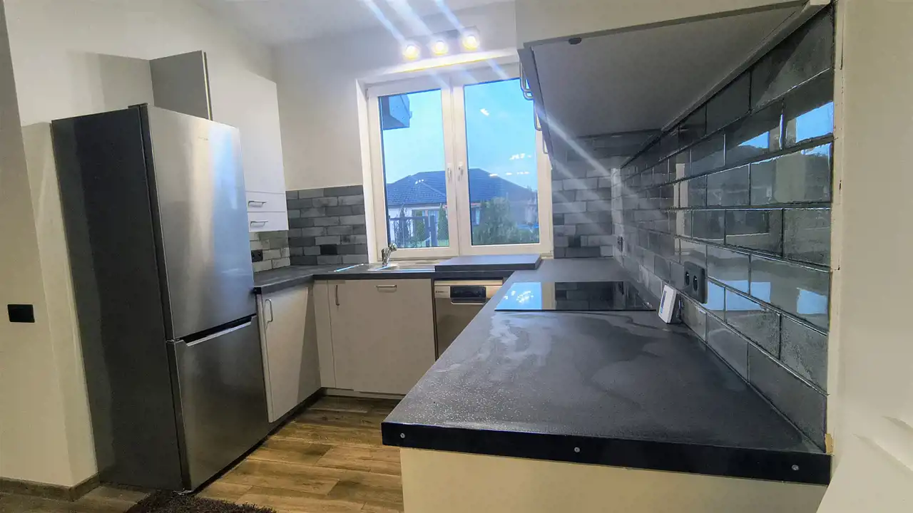 Kuchnia: W pełni wyposażona (z meblami na wymiar) i umeblowana nowym, jeszcze nieużywanym sprzętem AGD.