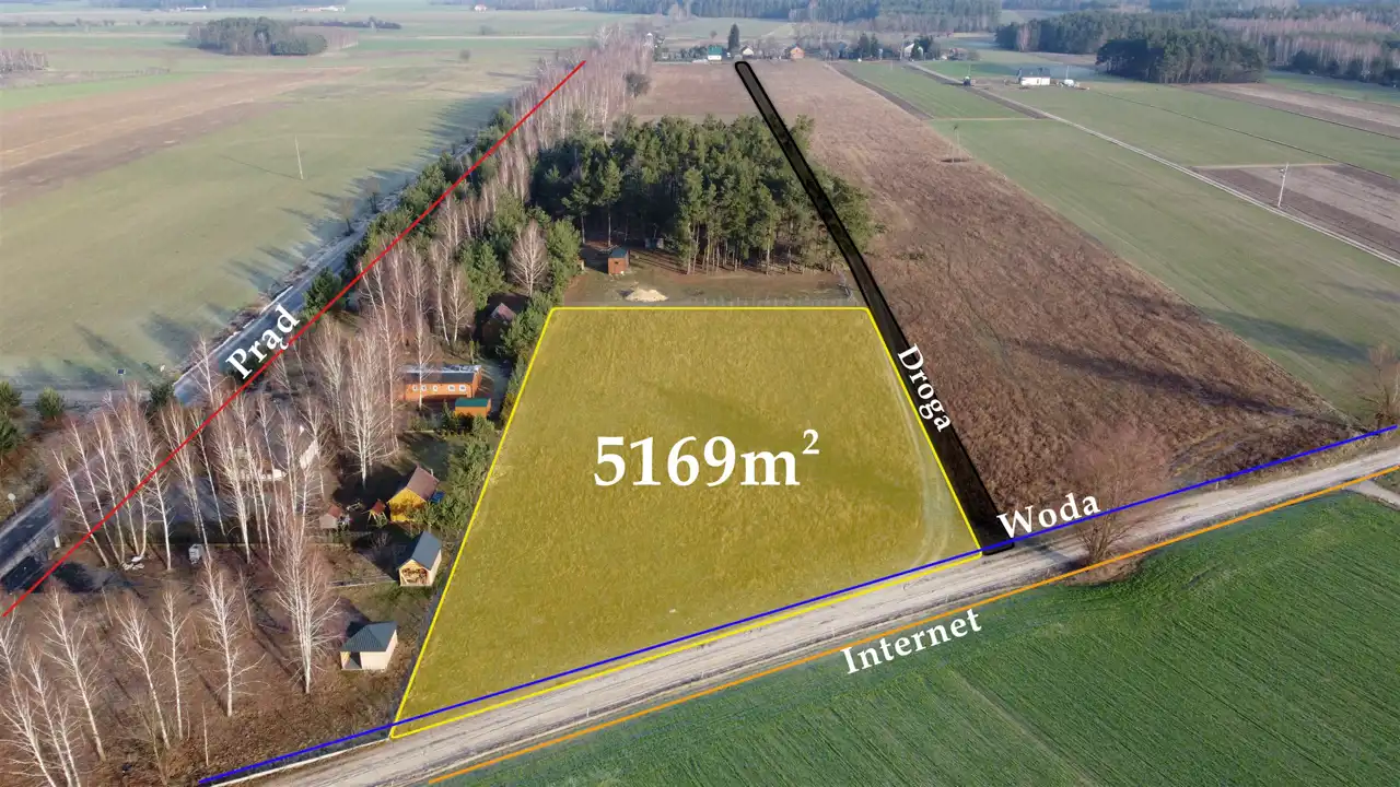 - Media Woda: brak; Kanalizacja: brak; Prąd: w ulicy; Gaz: brak