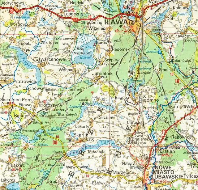 - Okoliczne powiatowe miasta to Iława oraz Nowe Miasto Lubawskie.