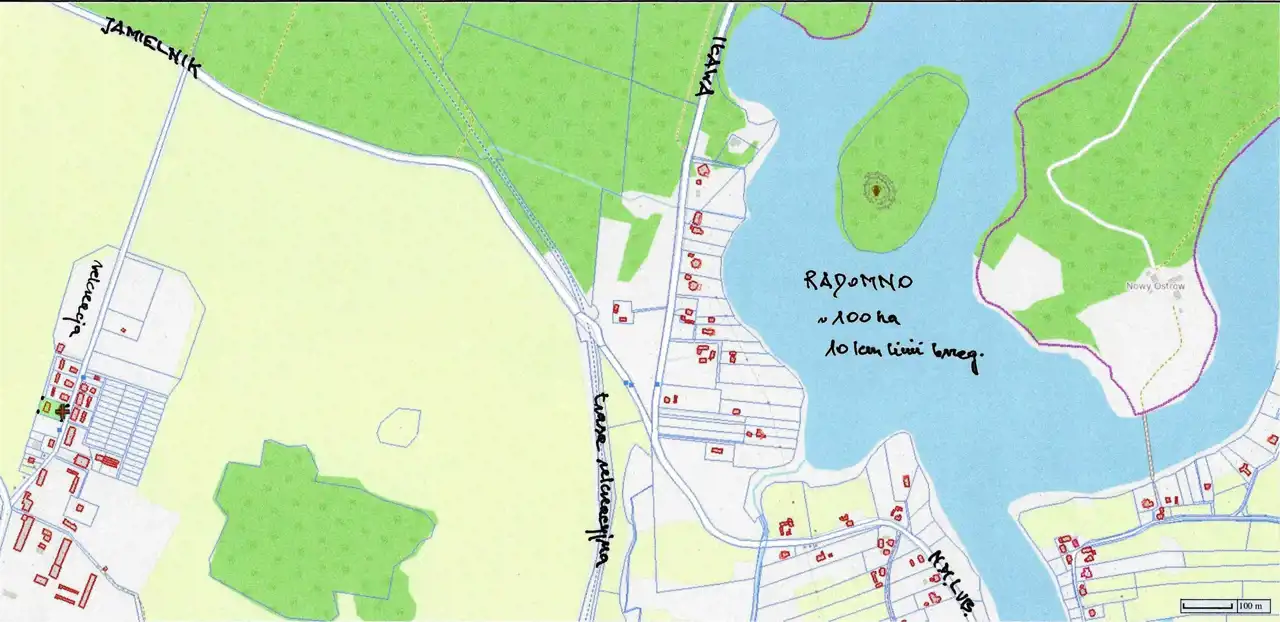 - Przy wsi duży kompleks leśny zaś w okolicy kilka jezior: Radomno, Studa i Gryźliny. Nad dużym rybnym jeziorem Radomno o pow. ~100 ha z 10 km linią brzegową znajduje się gminne kąpielisko z terenem rekreacyjnym.