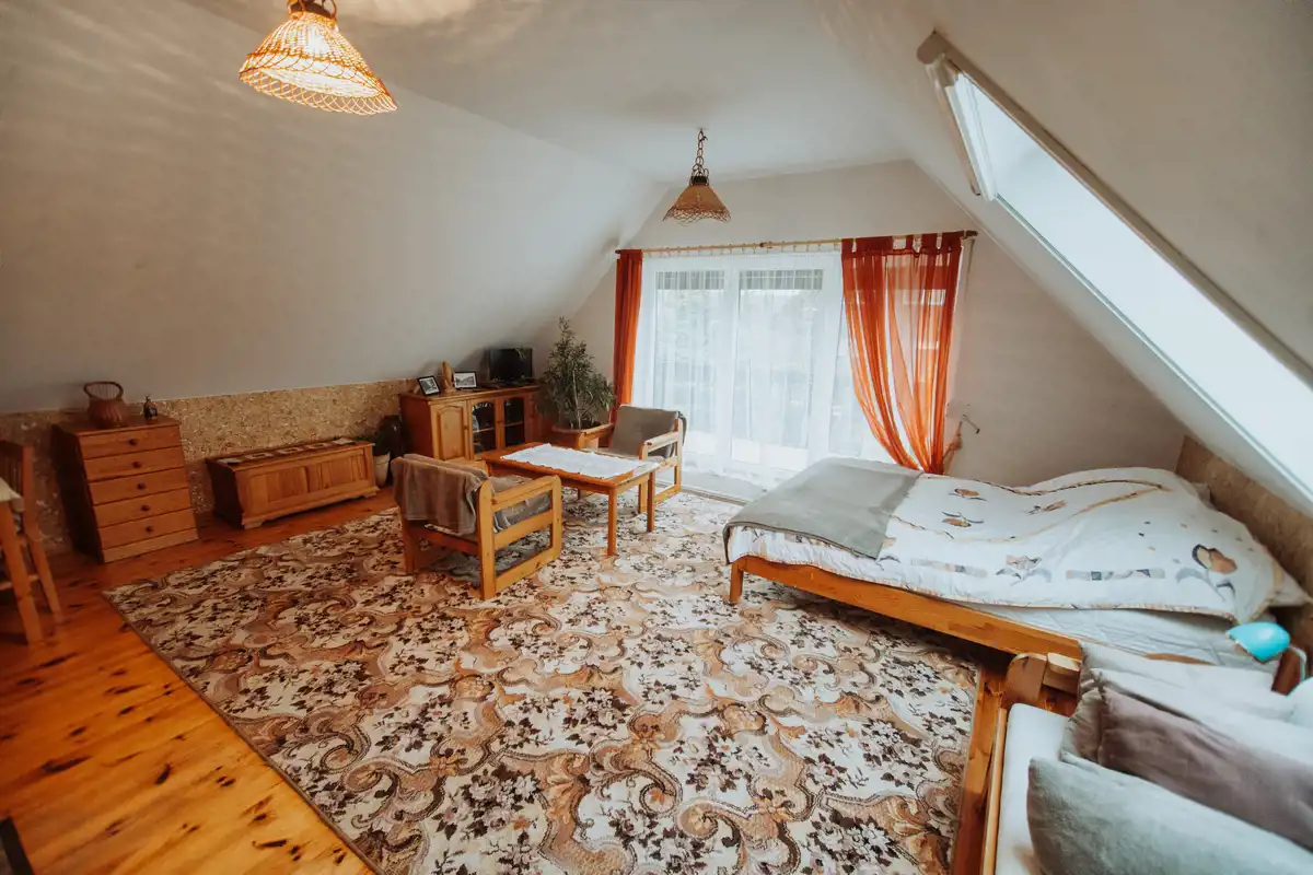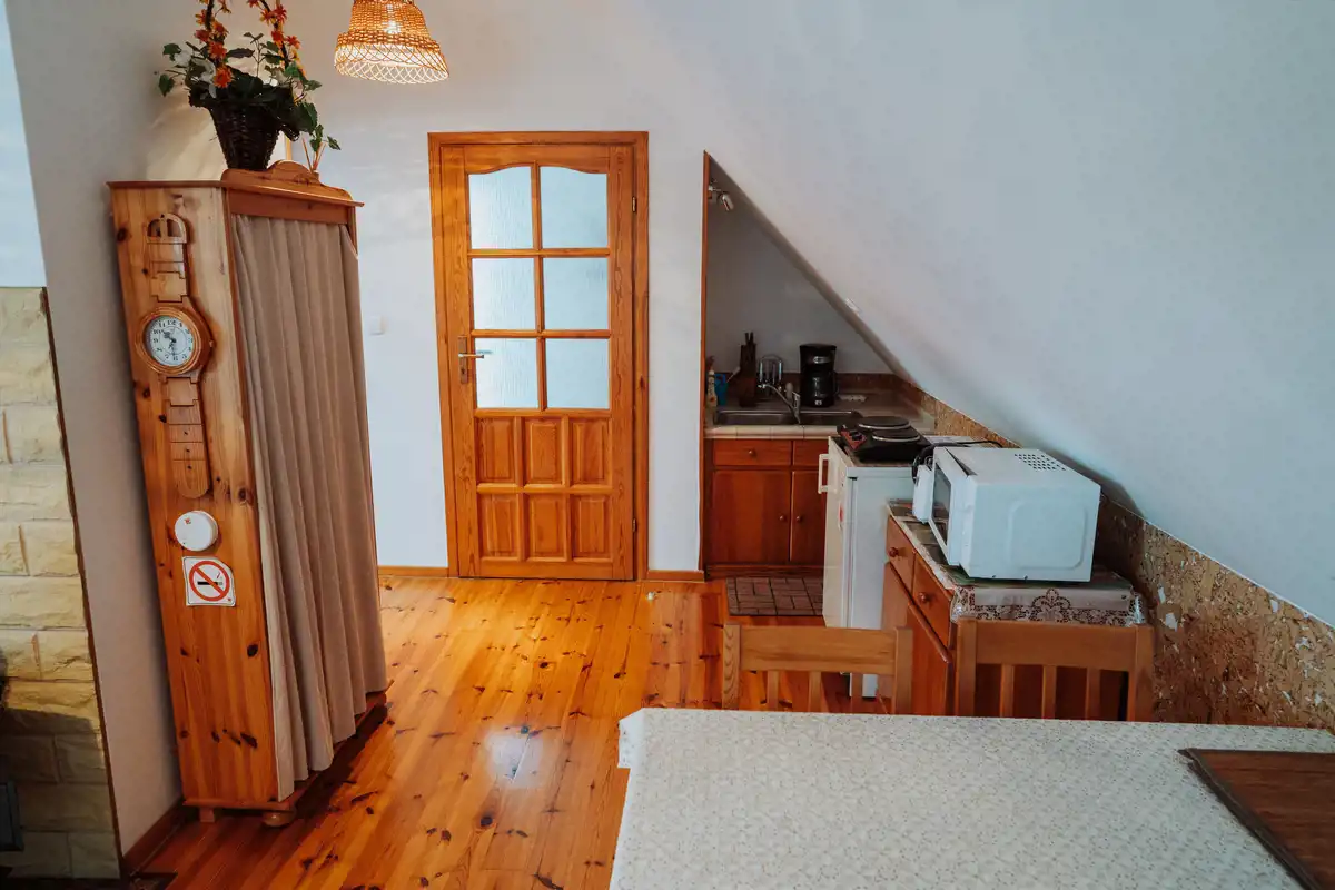 b) Piętro - pomieszczenie typu STUDIO z aneksem kuchennym oraz łazienka z toaletą. Z pokoju wyjście na taras.