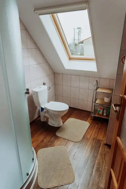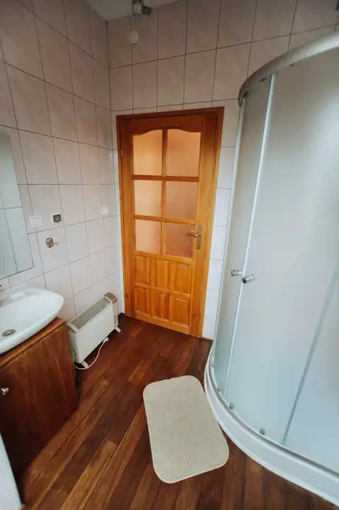 W budynku okna aluminiowe, rolety zewnętrzne. Na podłodze deska sosnowa 3,5 cm grubości.