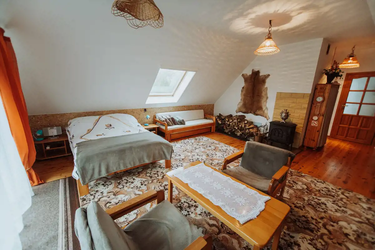 W salonie znajduje się kominek norweskiej firmy Jotul. W budynku ogrzewanie elektryczne.