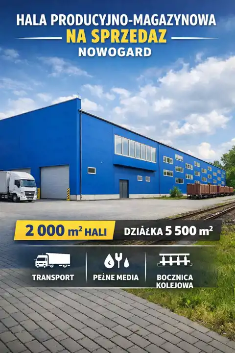 5 547 m². Nieruchomość idealnie sprawdzi się jako zaplecze produkcyjne, magazynowe lub logistyczne. Centralnym elementem oferty jest hala o powierzchni około 2 000 m², zaprojektowana w sposób umożliwiający elastyczne wykorzystanie przestrzeni. Obiekt posiada pełne uzbrojenie techniczne – dostępne są wszystkie niezbędne media. Teren wokół hali został przystosowany do obsługi transportu ciężkiego. Szeroki wjazd oraz utwardzony plac manewrowy pozwalają na swobodne poruszanie się samochodów typu TIR. Dodatkowym atutem jest bezpośrednia bliskość bocznicy kolejowej, co znacząco zwiększa potencjał logistyczny nieruchomości. Lokalizacja zapewnia sprawną komunikację oraz szybki dojazd do głównych tras, a duża powierzchnia działki daje możliwość dalszej rozbudowy lub zagospodarowania według potrzeb przyszłego właściciela.