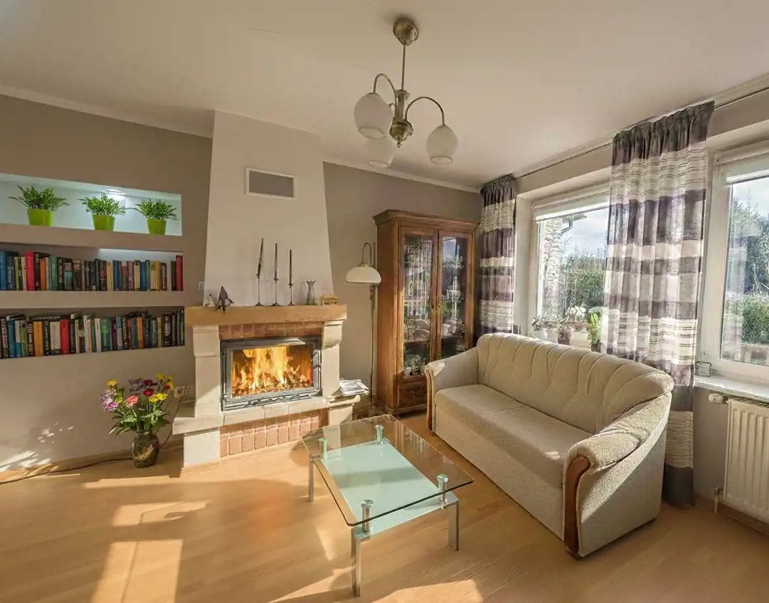 Sercem domu jest klimatyczny jasny salon z kominkiem oraz przestronna kuchnia z jadalnią .