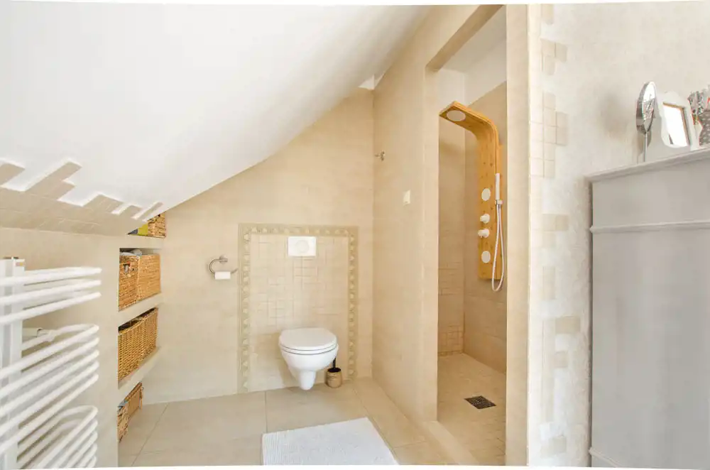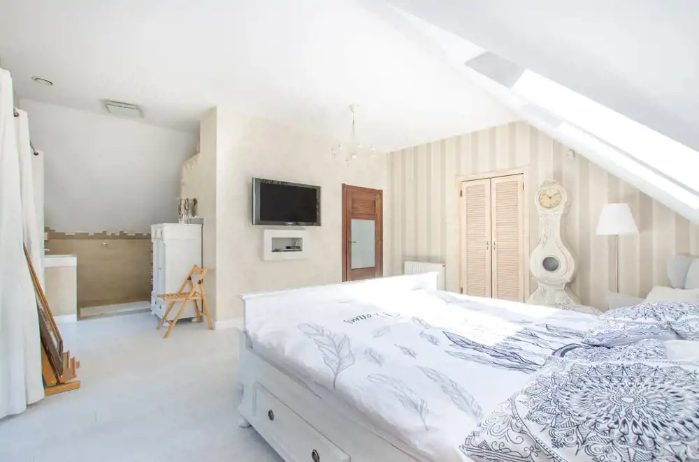 Pokój na dole, często poszukiwane rozwiązanie .Na gabinet, sypialnie rodziców, być może pokój dla dziadków, teściów. Zobaczcie sami zdjęcia sypialni rodziców? Jak w bajce, z własną garderobą i łazienką. Z sypialni wyjście na taras no i ten widok… Dzieci mają swoją łazienkę