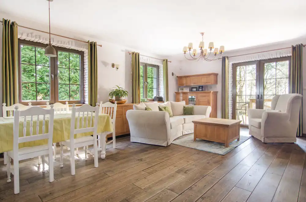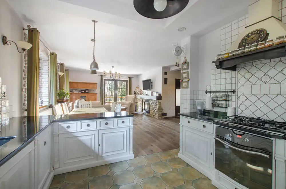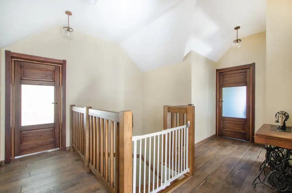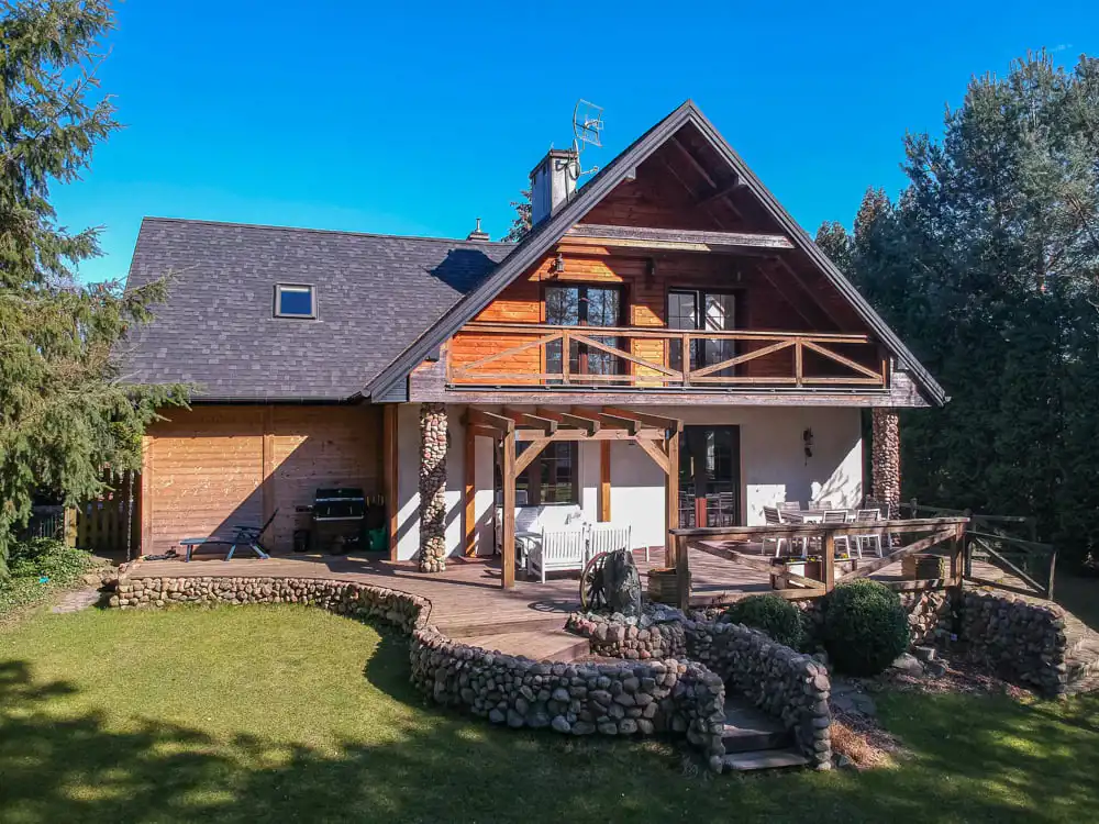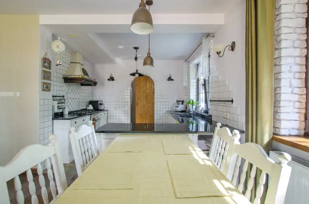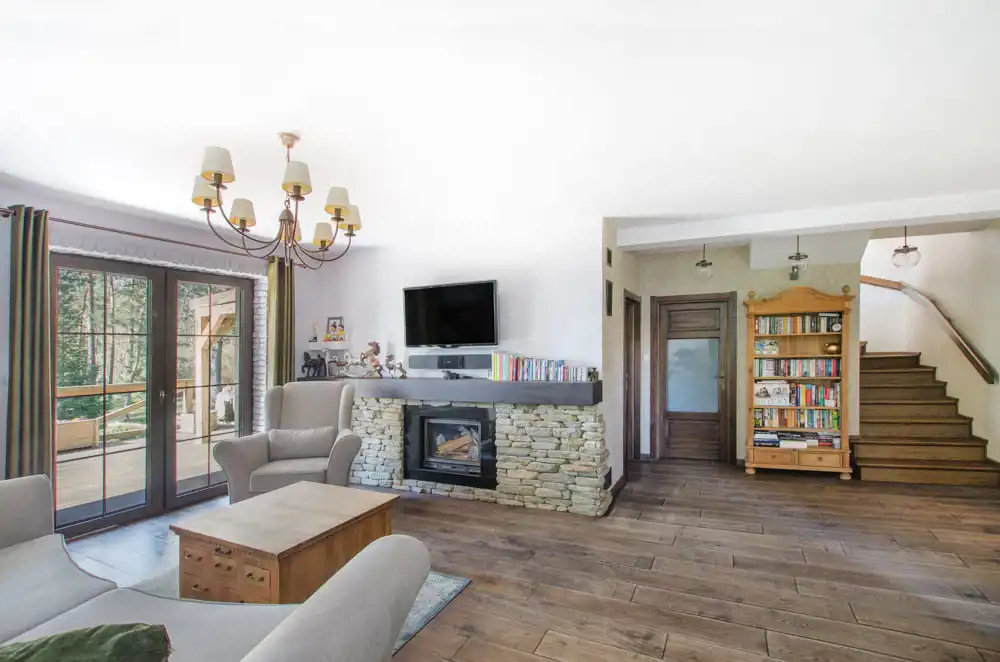 Bardzo klimatyczny, z duszą ,połączenie drewna z kamieniem .Dużo światła, duże okna… Kominek w salonie, spiżarka z drewnianymi przesuwnymi drzwiami, zresztą sam poczujesz na twarzy ten zachód słońca, przygotowując coś w kuchni.