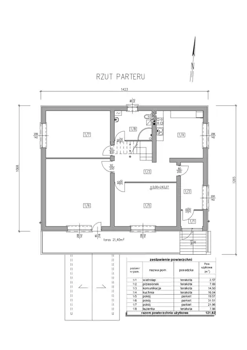 Parter (121 m²): wiatrołap, przestronny przedsionek, kuchnia z jadalnią, 3 duże pokoje, łazienka
