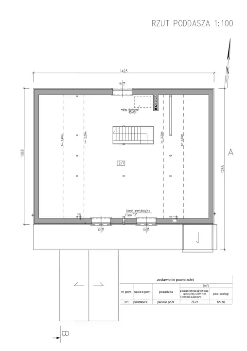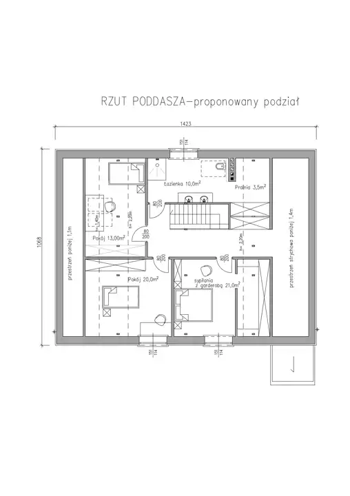 Poddasze (77 m²): możliwość aranżacji 3 pokoi, łazienki i pralni; dodatkowo strych