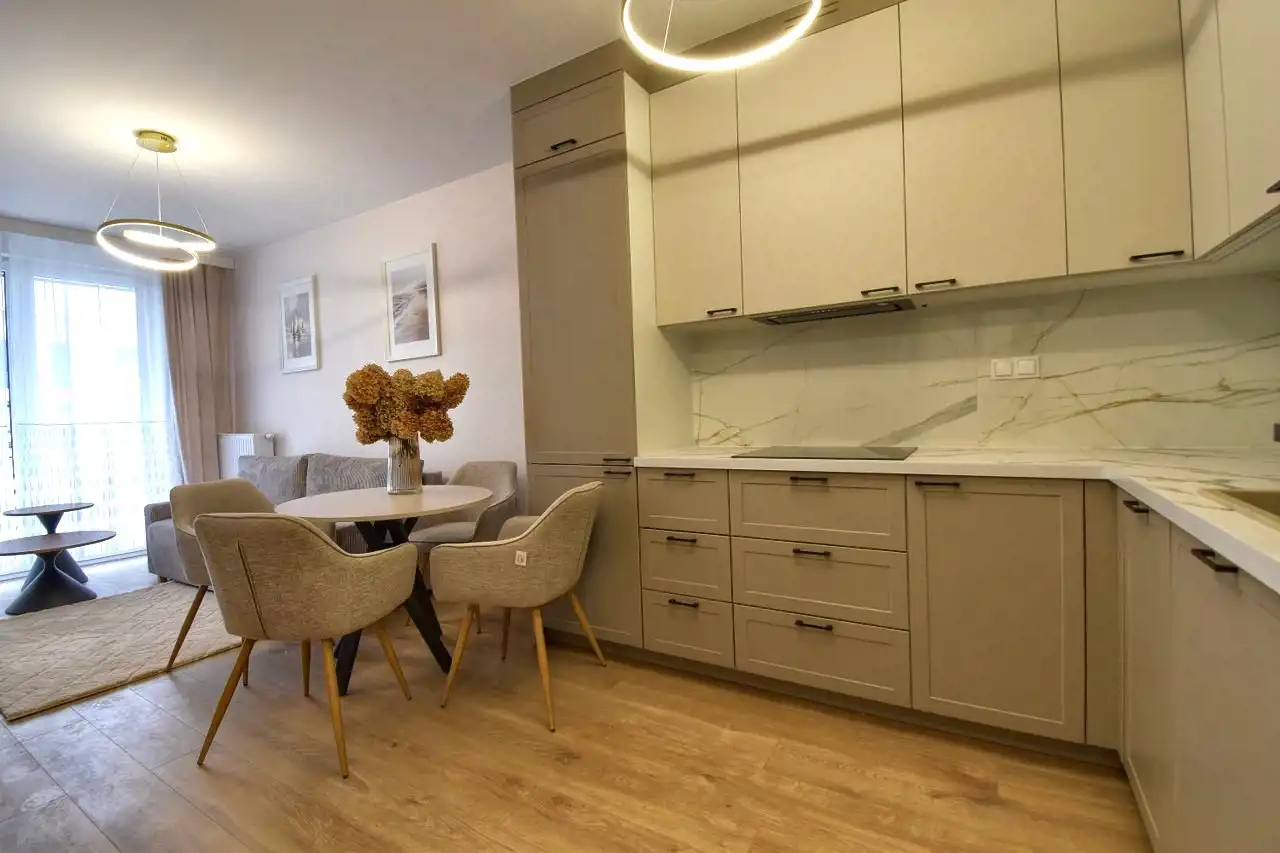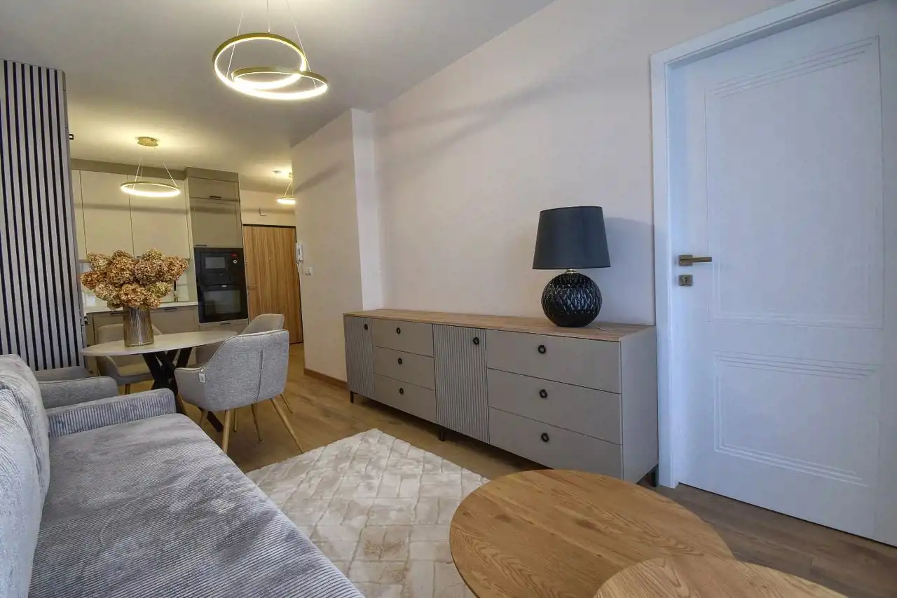 Mieszkanie zostało wykończone w wysokim standardzie, jest w pełni umeblowane i wyposażone w sprzęt AGD (lodówka, zmywarka, piekarnik, płyta indukcyjna).