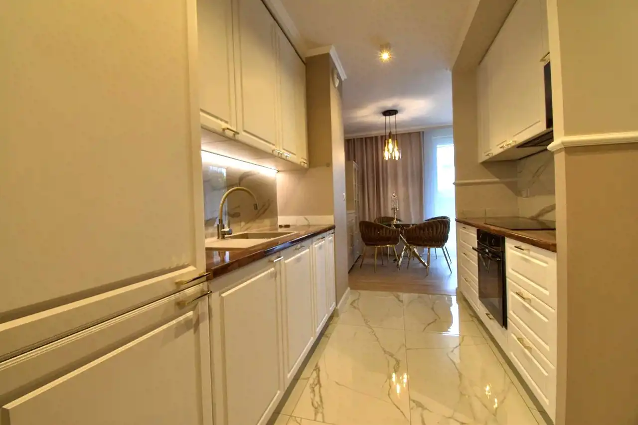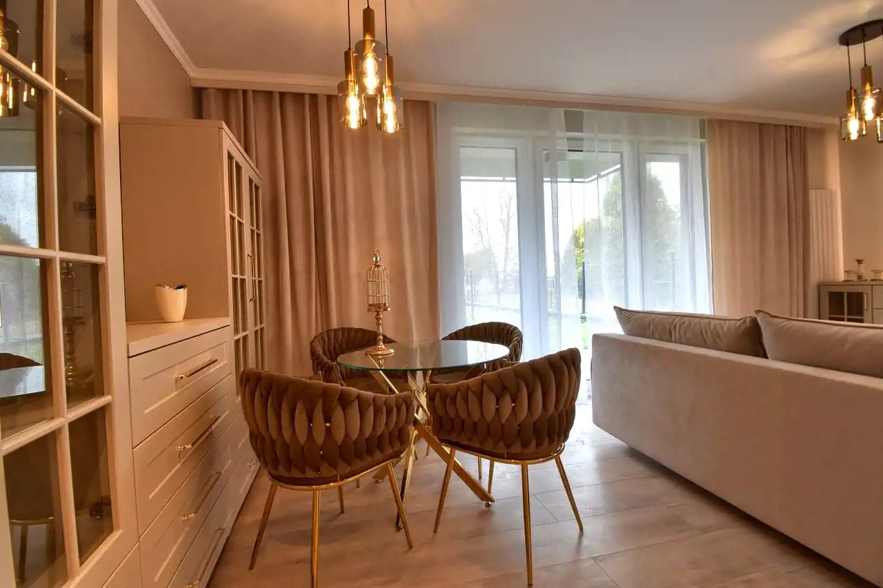 Mieszkanie zostało wykończone w wysokim standardzie, jest w pełni umeblowane i wyposażone w sprzęt AGD (lodówka, zmywarka, piekarnik, płyta indukcyjna).