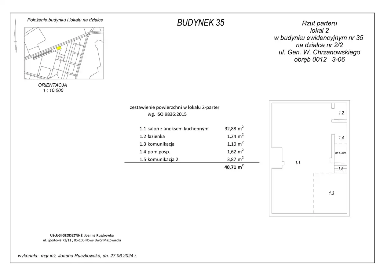 Parter : salon z aneksem kuchennym 32,88 m2, łazienka 1,24 m2, hall 5 m2, pom. gospodarcze 1,62 m2.
