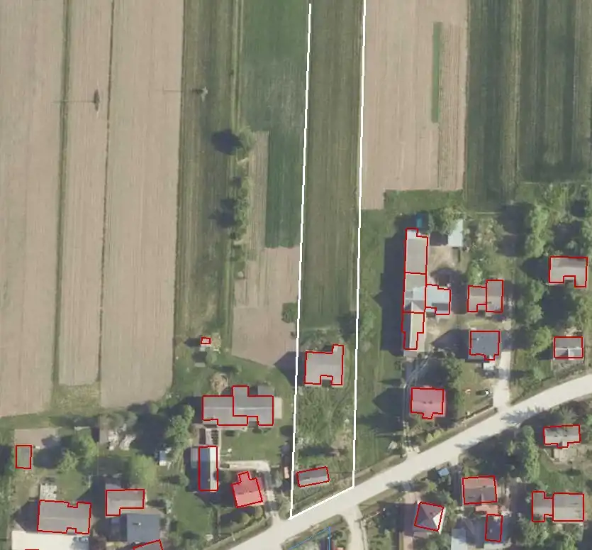 - Działka usytuowana pomiędzy zabudową domów jednorodzinnych.