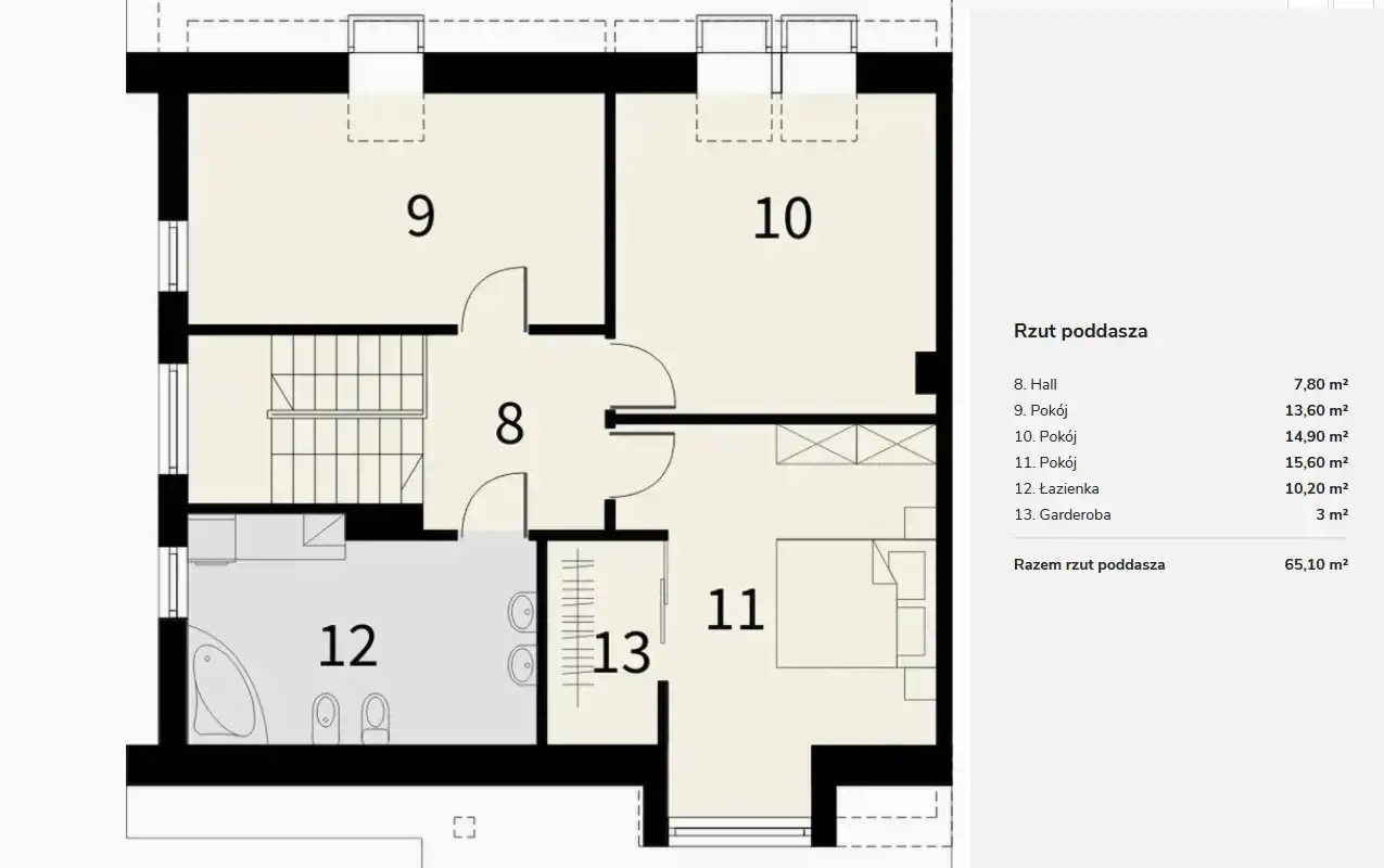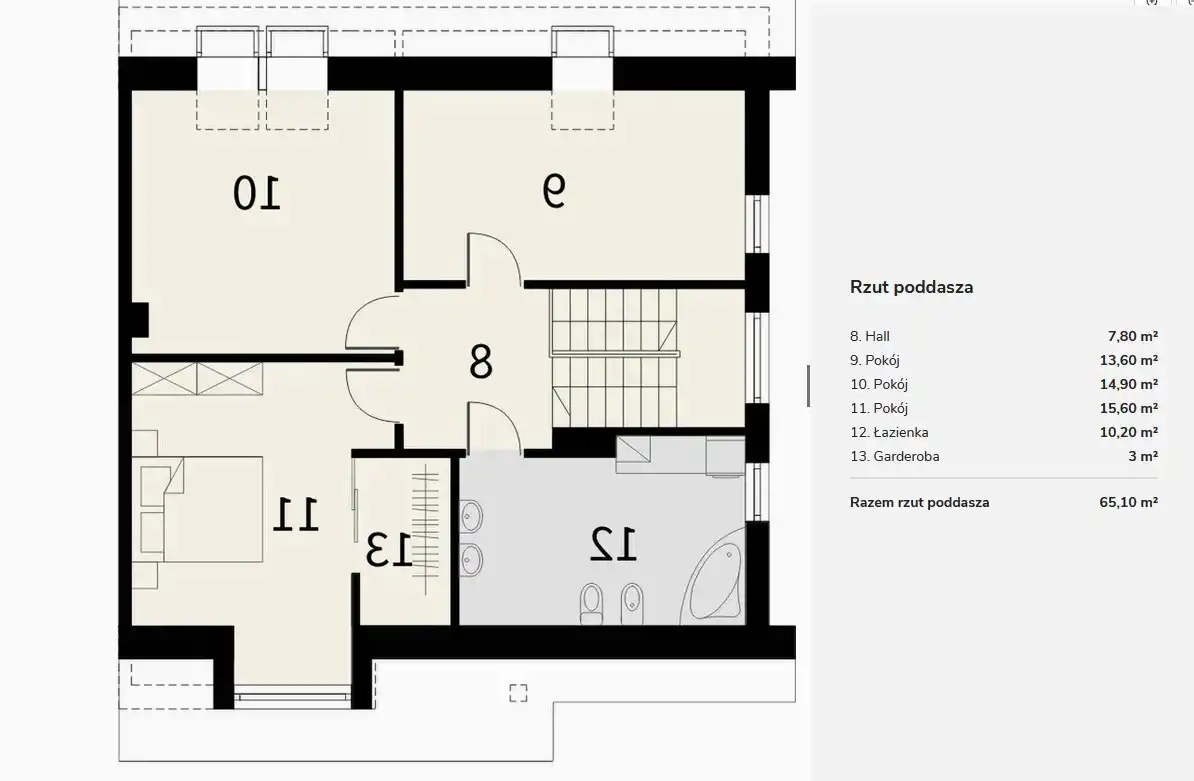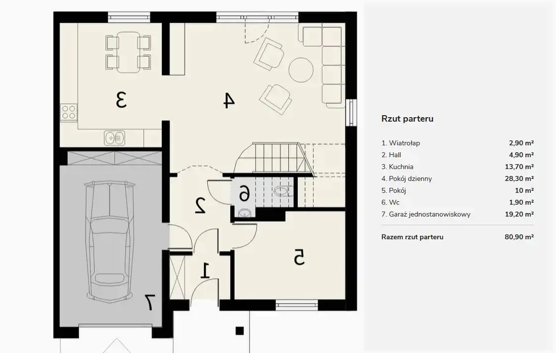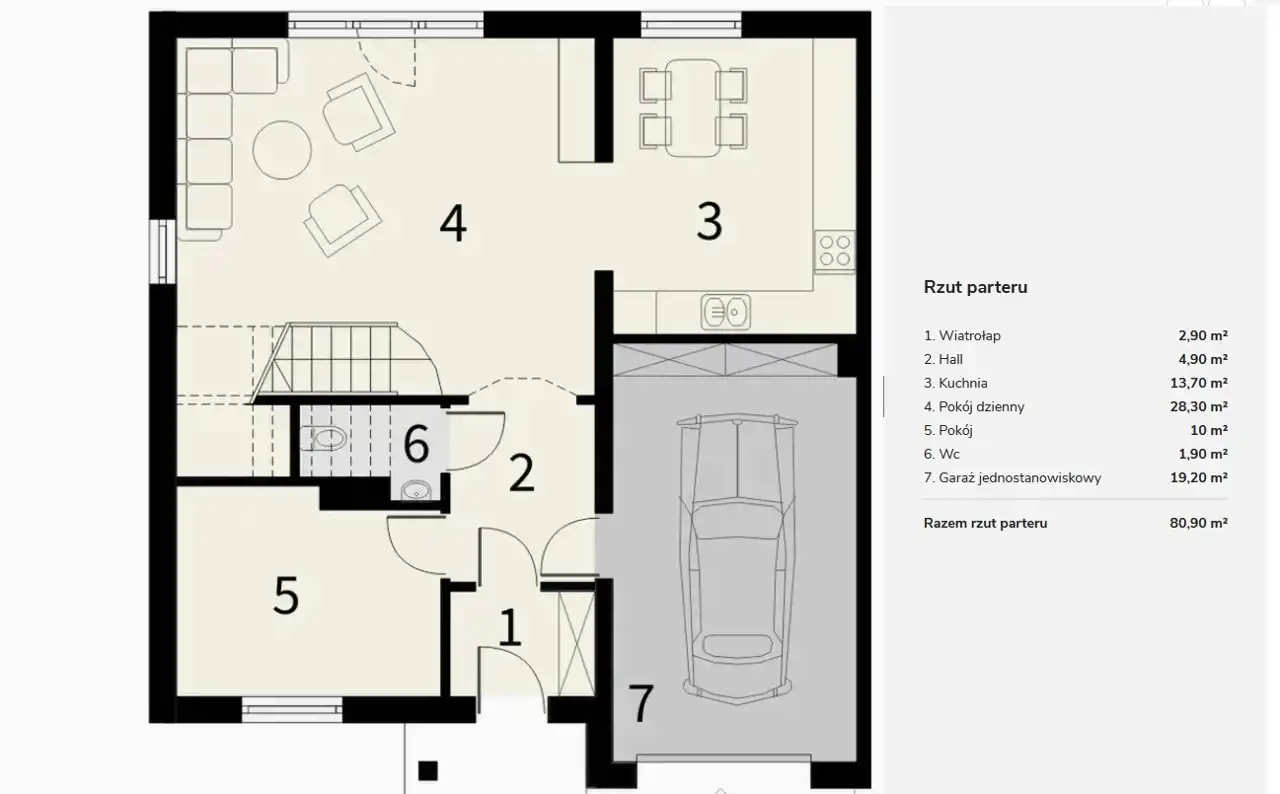 Budynek niepodpiwniczony piętrowy z garażem w bryle. Na parterze obok salonu i kuchni znajduje się także dodatkowy gabinet. Na piętrze znajdują się 3 sypialnie, garderoba oraz łazienka.