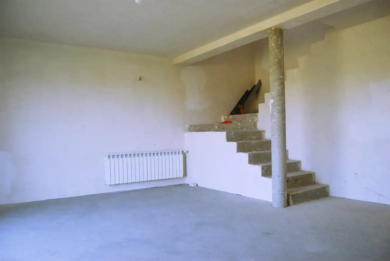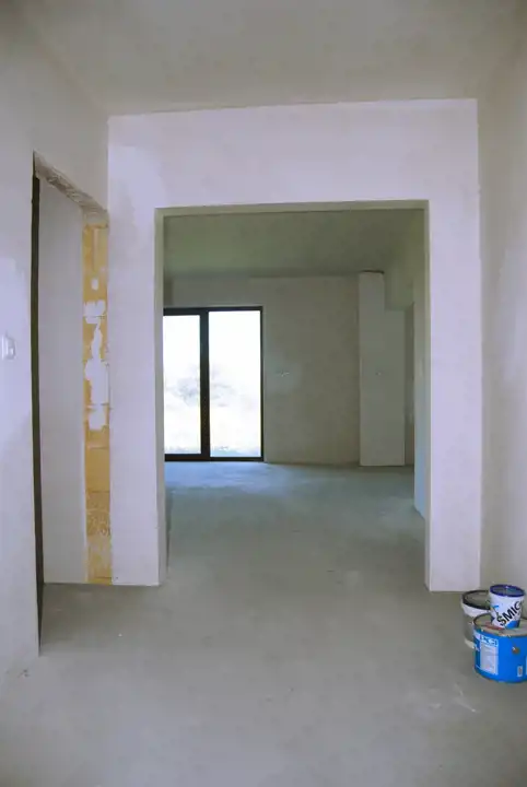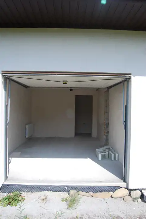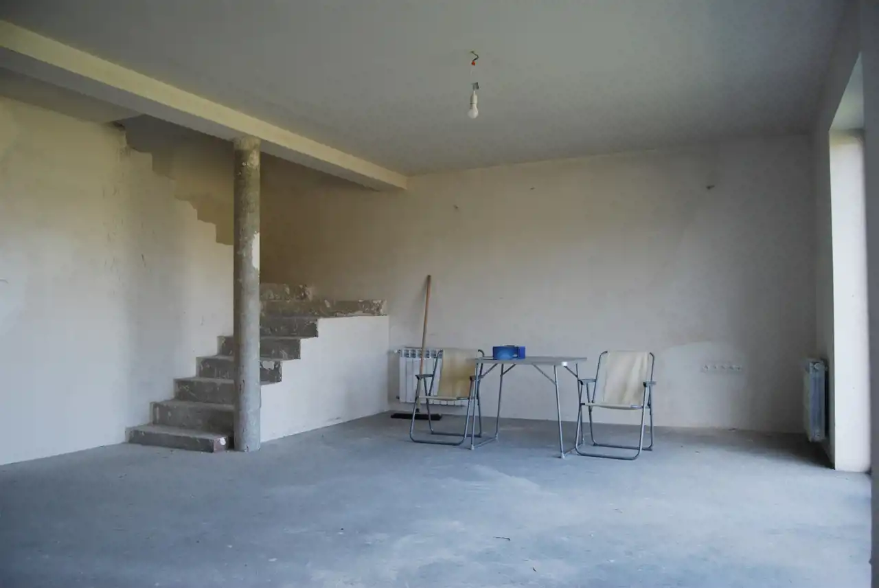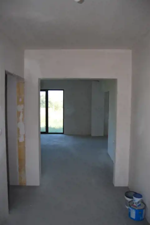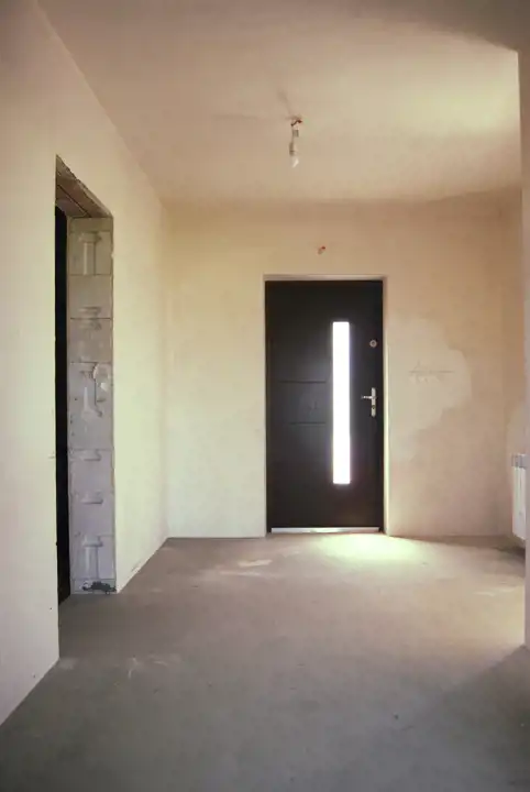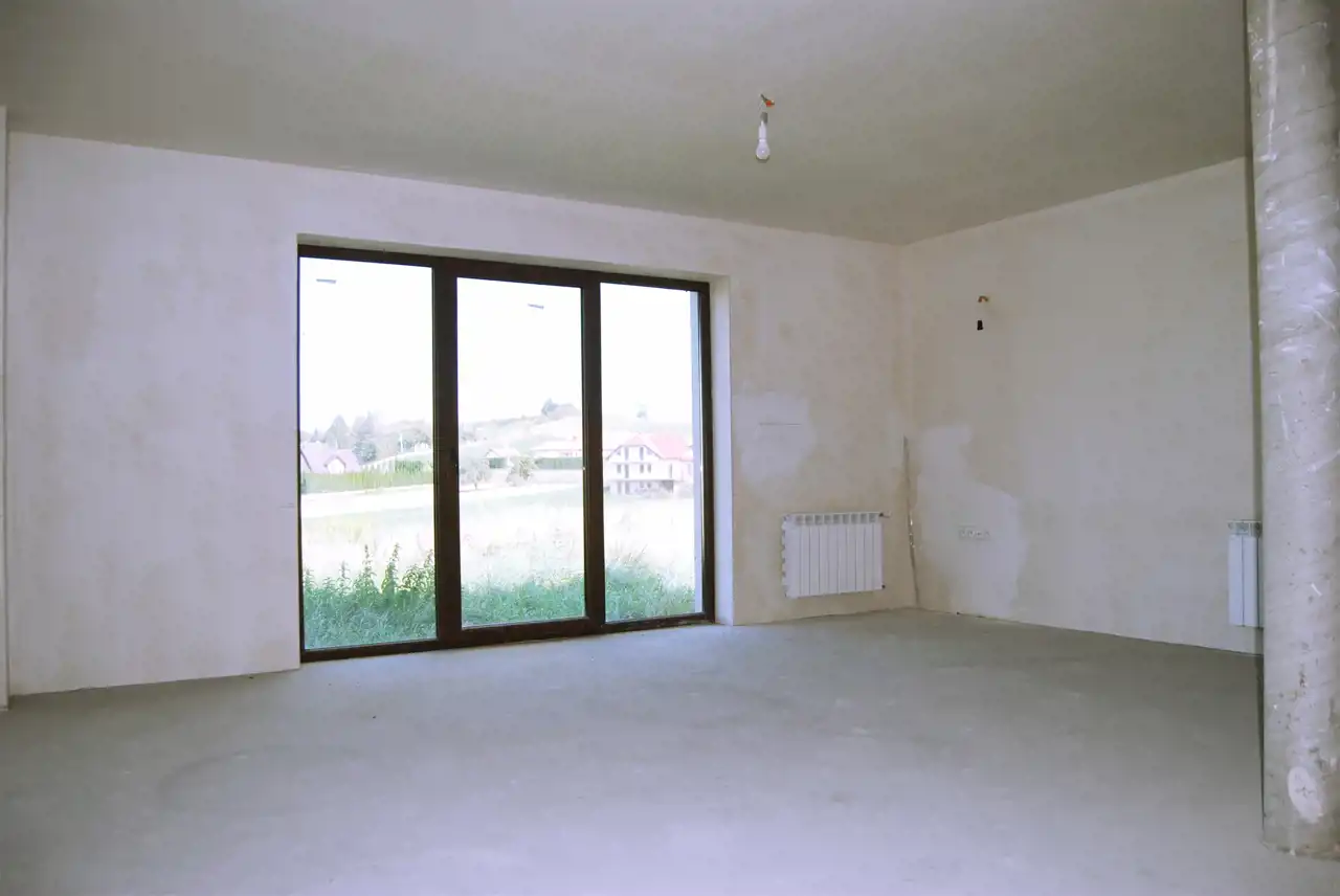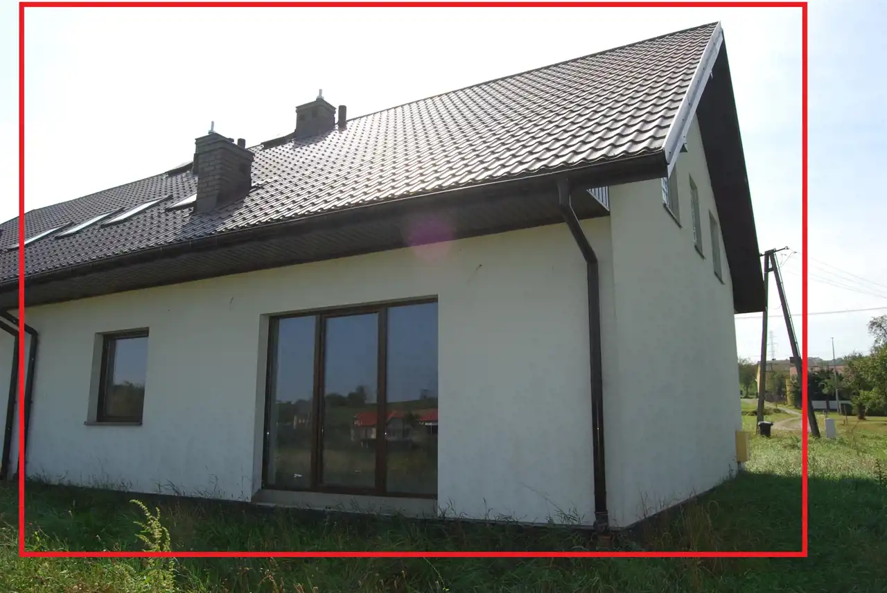 Dom piętrowy, bliźniaczy w stanie deweloperskim zamkniętym - wykonane wszystkie instalacje, tynki oraz posadzki, zamontowany kocioł gazowy, okna, drzwi i brama garażowa.