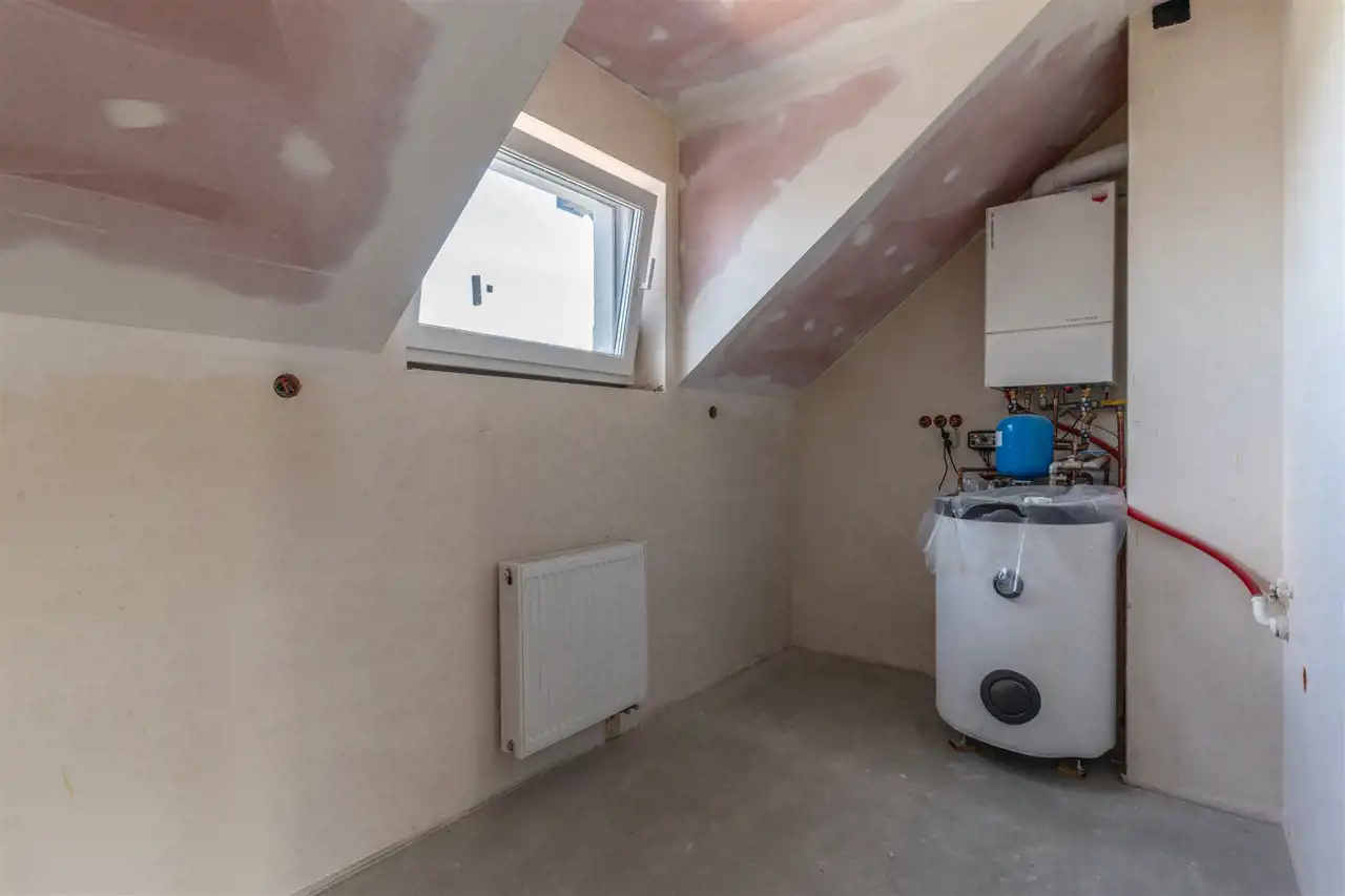 Instalacja hydrauliczna zawiera grzejniki w pokojach na piętrze, ogrzewanie podłogowe na całym parterze budynku oraz w łazience na piętrze, kocioł dwufunkcyjny gazowy z zamkniętą komorą spalania, sterownikami oraz zasobnikiem na ciepłą wodę.
