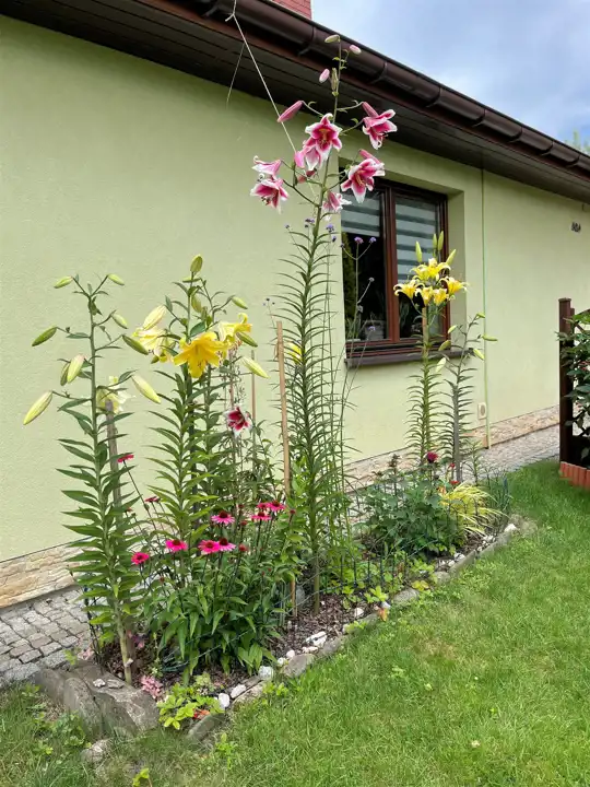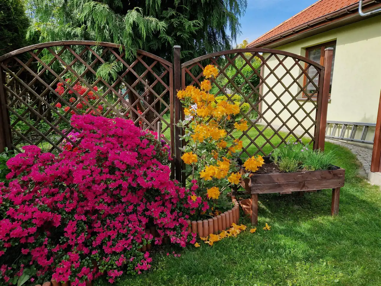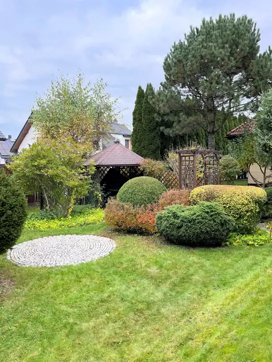 Ogród zagospodarowany: ozdobne piękne rośliny, krzewy, domek na narzędzia i sprzęt ogrodowy, wybrukowany podjazd oraz ogrodzenie z siatki i drewna, w ogrodzie studnia głębinowa woda do podlewania roślin i nie tylko.