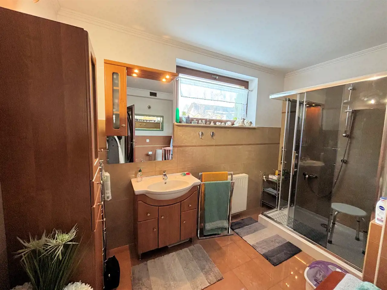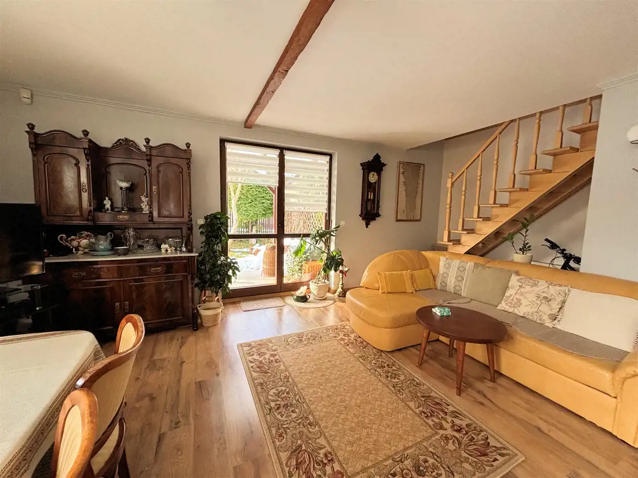 Dom posiada drewniane okna, ładne i zadbane podłogi z gresu i paneli oraz wydajne ogrzewanie gazowe