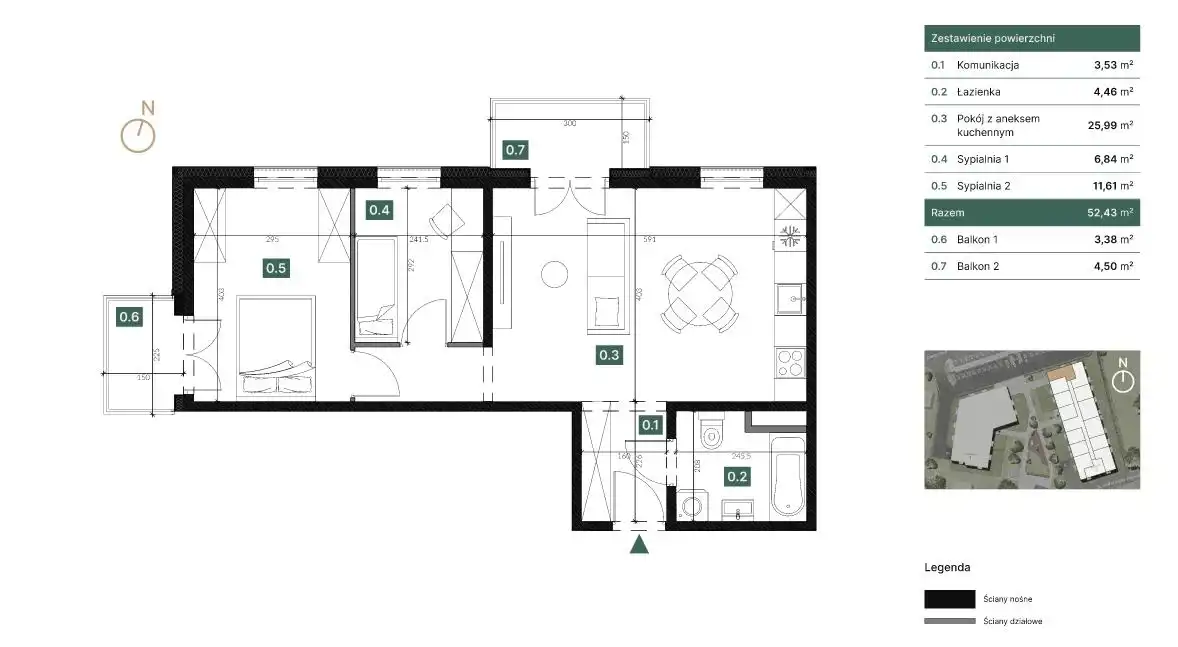 - Charakterystyka mieszkania 52.43 m2, 3 pokoje