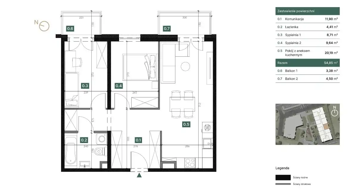 - Charakterystyka mieszkania 54.85 m2, 3 pokoje