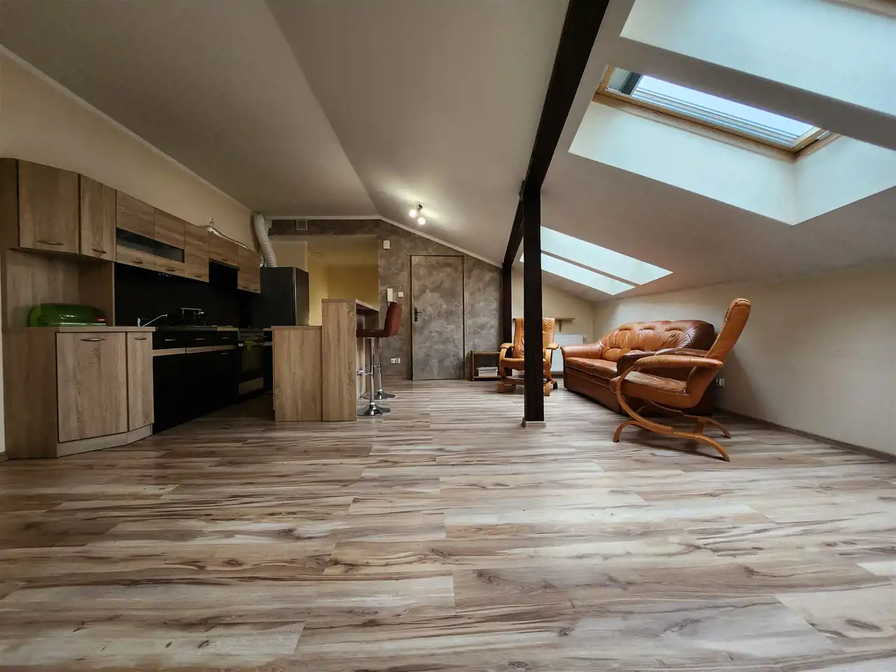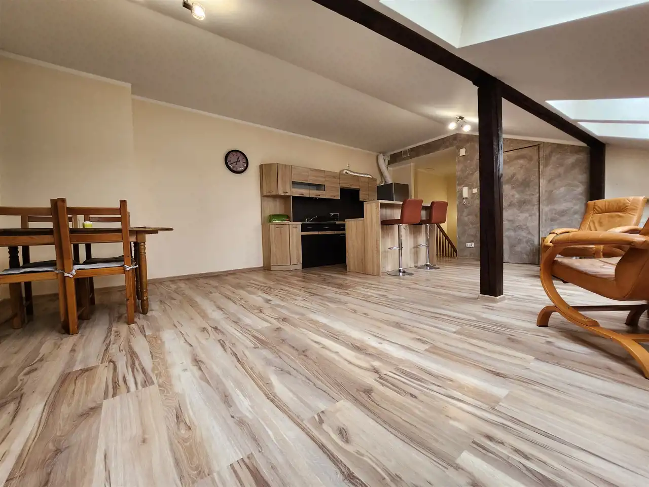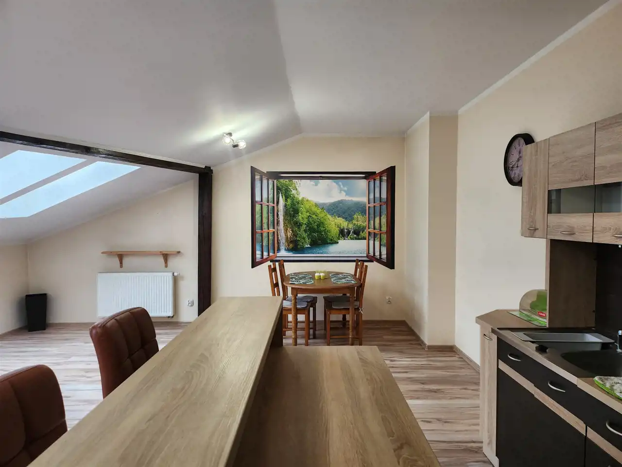 Poziom II – przestronny, jasny salon z aneksem kuchennym oraz łazienka z wanną. Układ mieszkania daje możliwość wydzielenia niezależnej sypialni – idealne rozwiązanie dla tych, którzy cenią sobie prywatność i komfort.