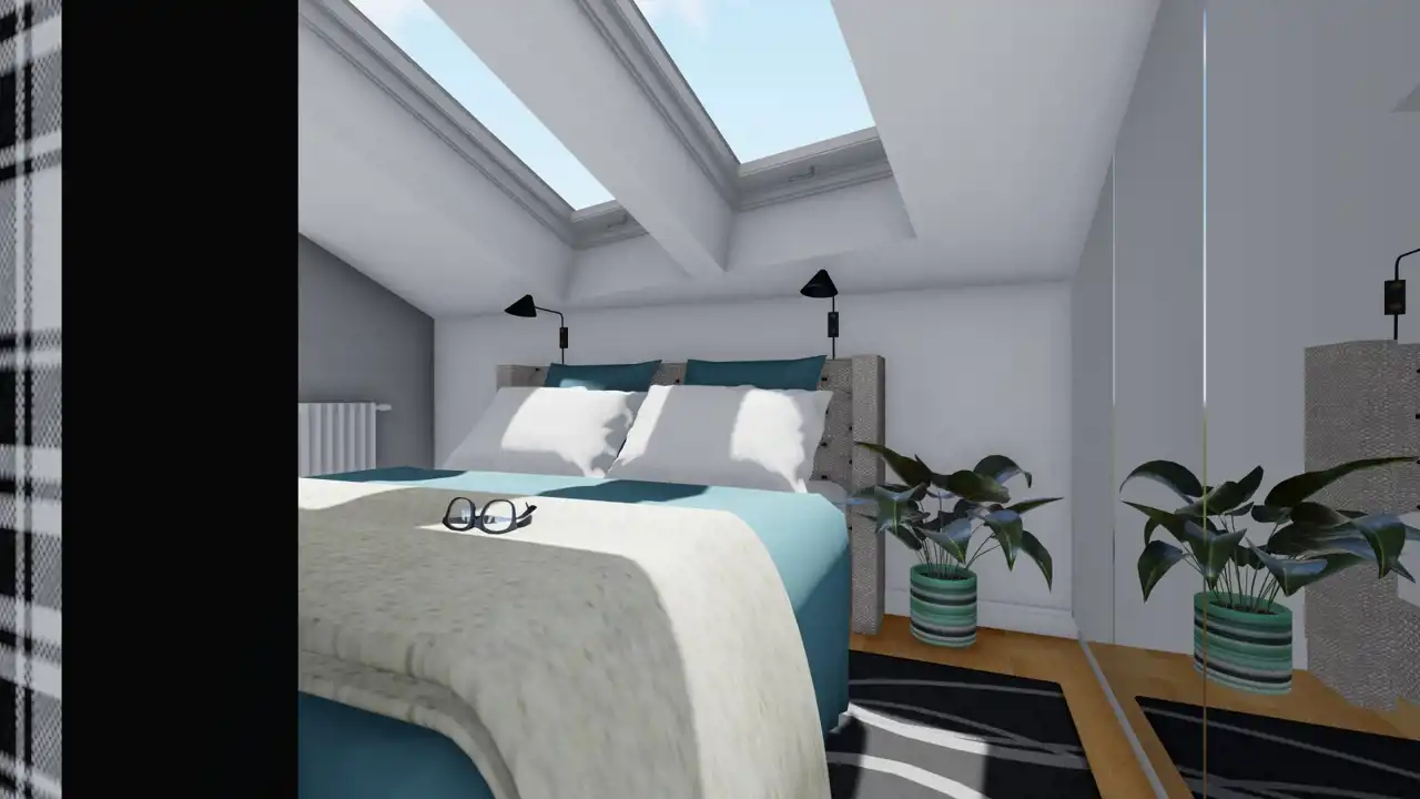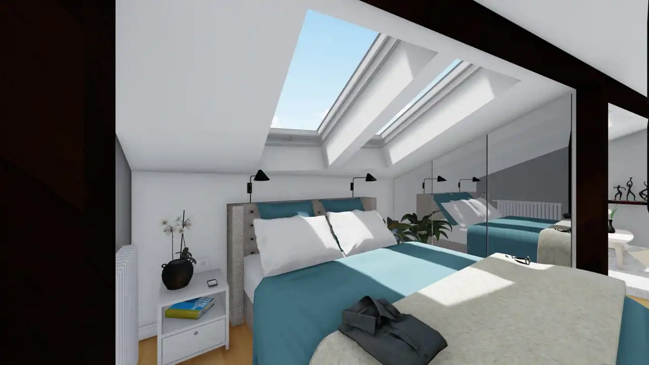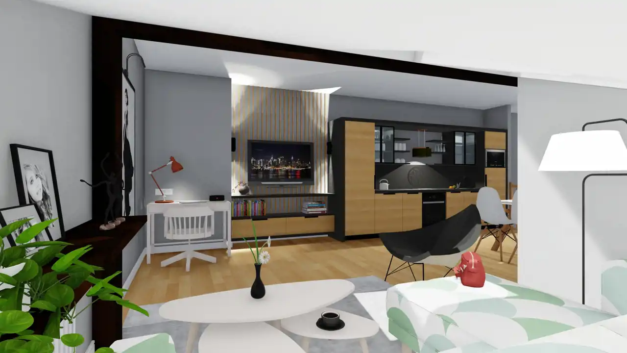 Poziom II – przestronny, jasny salon z aneksem kuchennym oraz łazienka z wanną. Układ mieszkania daje możliwość wydzielenia niezależnej sypialni – idealne rozwiązanie dla tych, którzy cenią sobie prywatność i komfort.