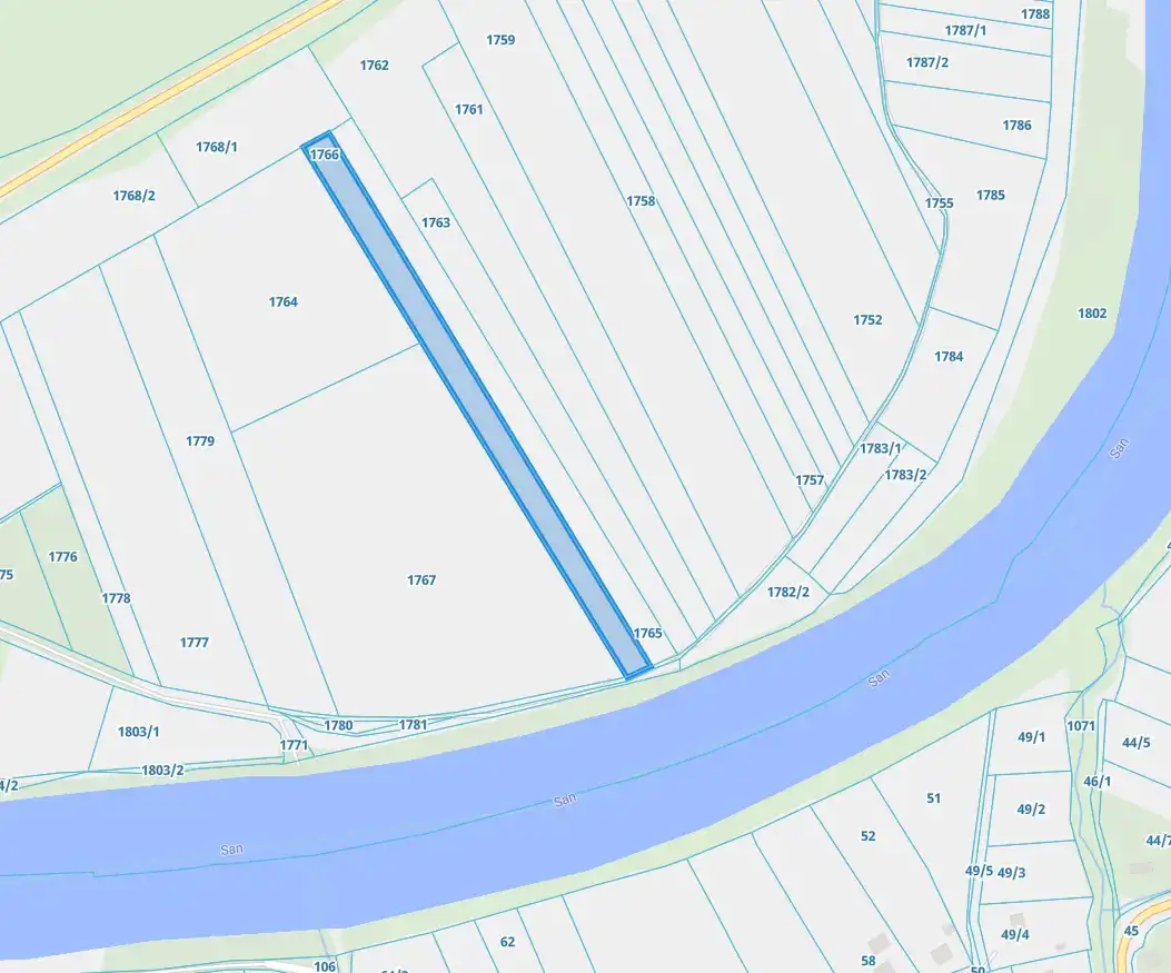 Nr Działki 1766, w tym rejonie San jest głęboki, jest to idealne miejsce na bazę Wędkarska. Działka jest pośród malowniczej przyrody, jest idealna cisza, do Działki prowadzi utwardzona droga publiczna która dzieli działkę od Koryta rzeki. Kiedyś działka dochodziła bezpośrednio do Sanu jednak nie było wtedy dostępu do drogi.