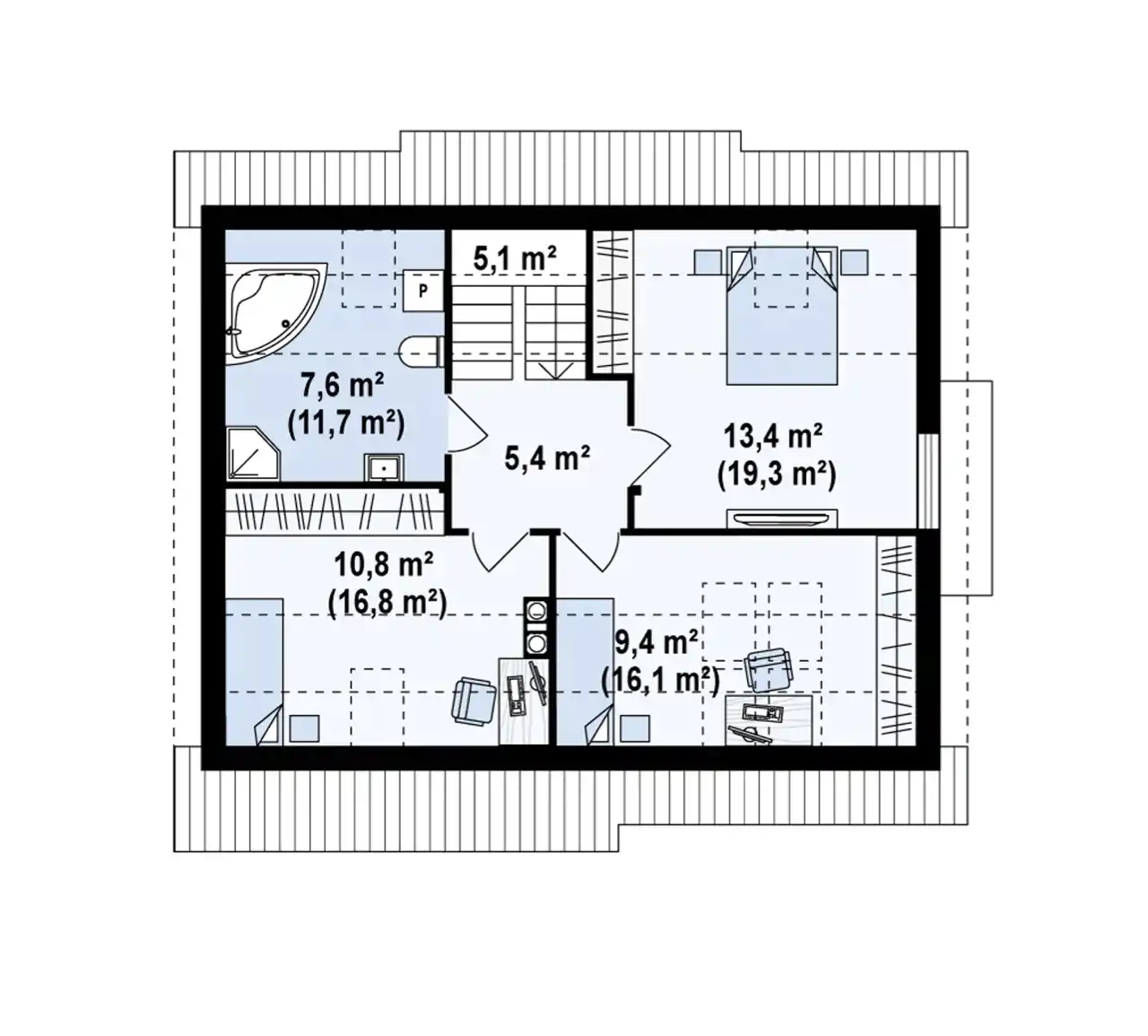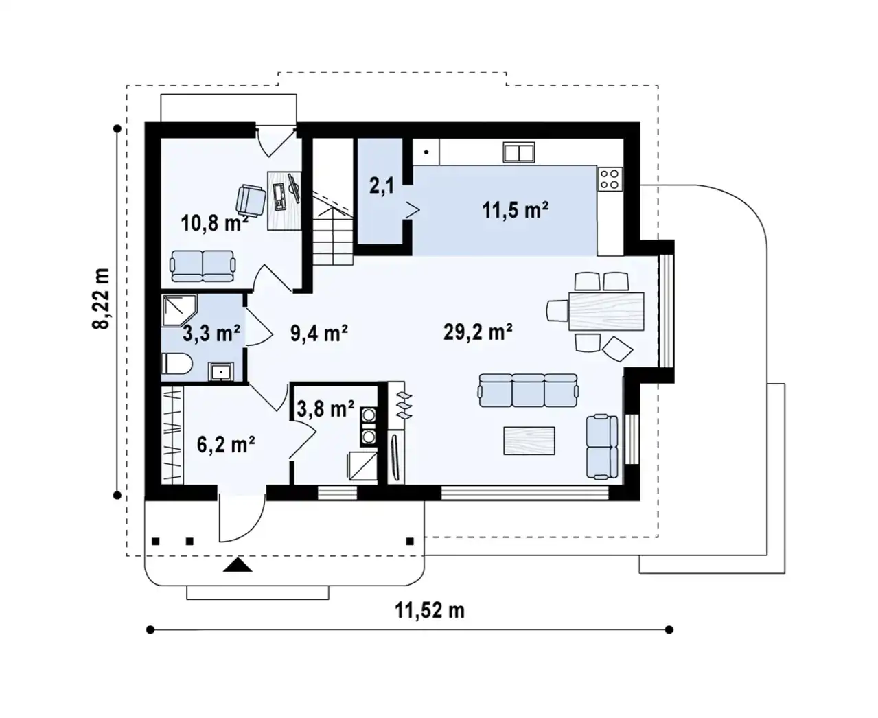 Powierzchnia użytkowa domu wynosi 125,65 m². Układ został zaplanowany tak, aby na co dzień był wygodny i praktyczny.