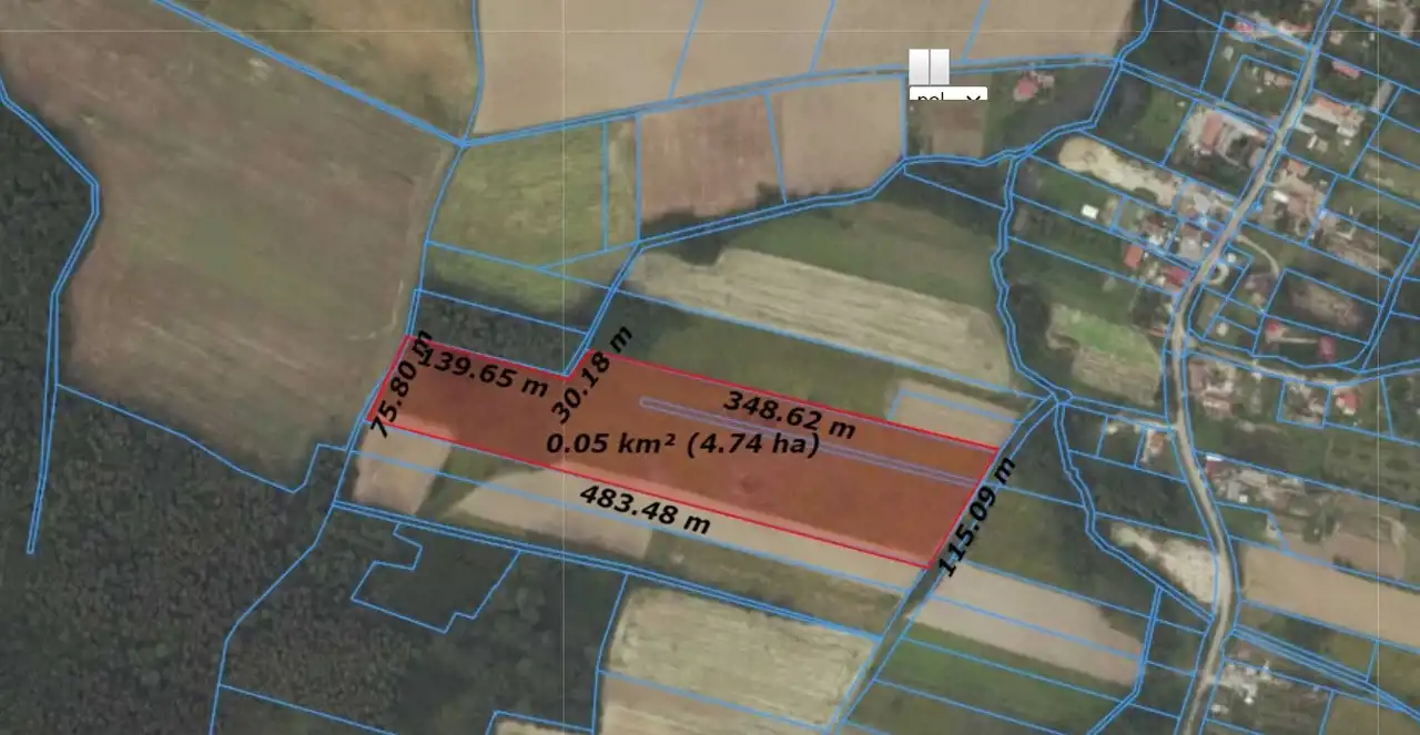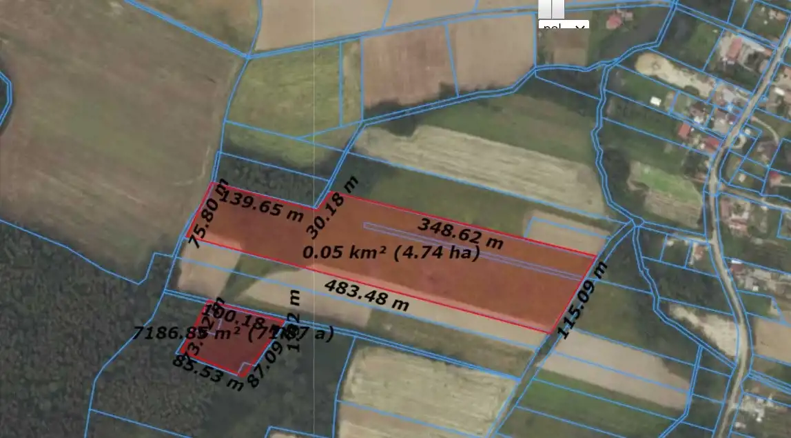 Sprzedam działkę rolną o powierzchni 54 300 m.kw. w Piekarach. Działka płaska, prostokątna otoczona polami i granicząca z lasem. Składa się z dwóch działek o pow. 47500 i 6800 m.kw. Rodzaj użytków to RIIIA, RIIIB, RIVA, RIVB, RV, ŁIII. Przeznaczenie nieruchomości w Miejscowym Planie Zagospodarowania Przestrzennego - rola. Do najbliższych zabudowań ok. 120 metrów. Połączenie z drogą gminną za pośrednictwem sąsiadującej drogi utwardzonej.