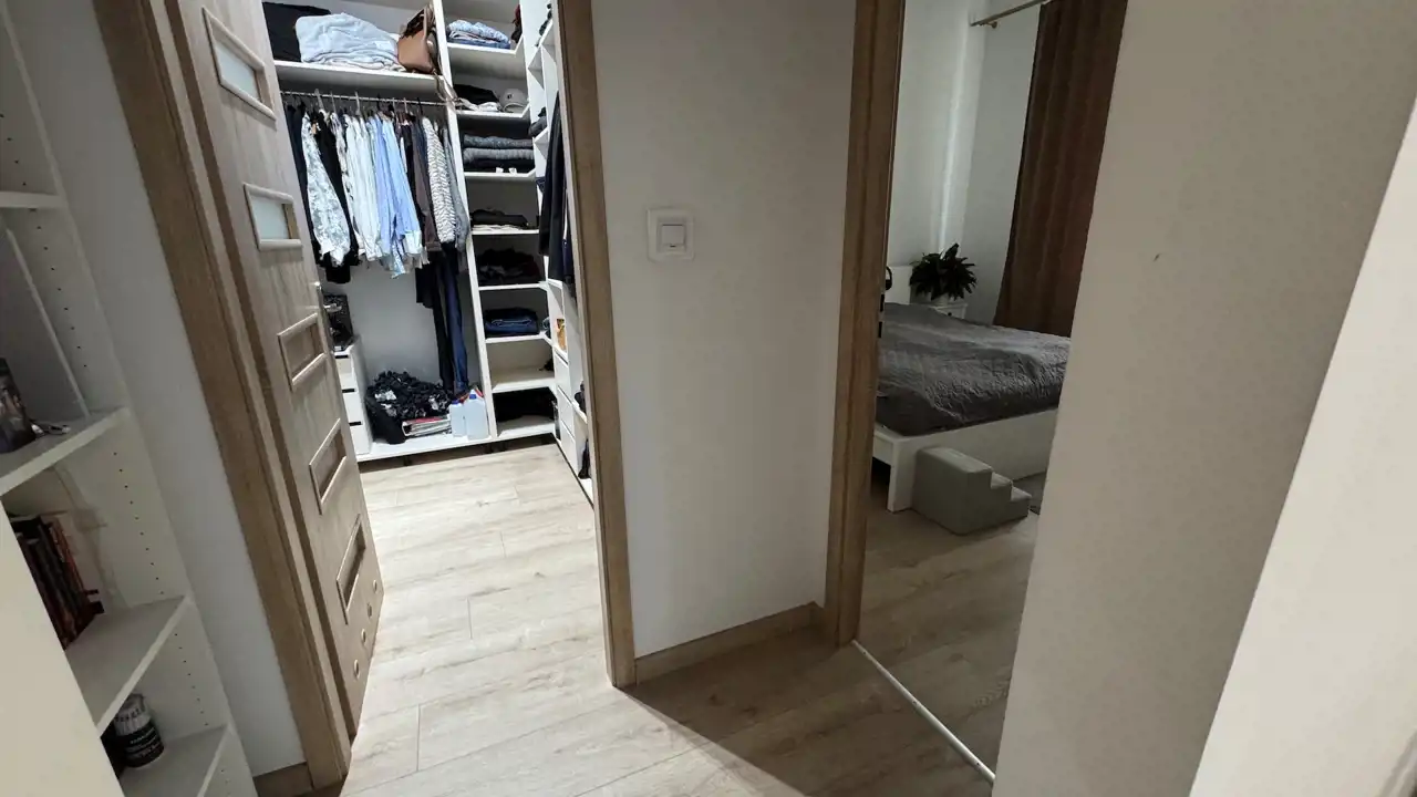 Układ: 2 pokoje, łazienka, garderoba, pomieszczenie gospodarcze