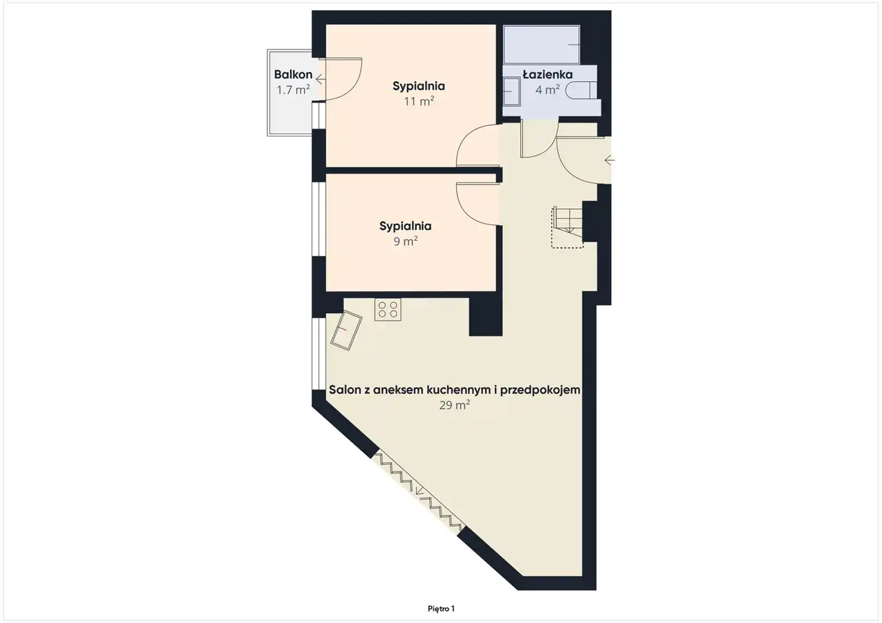 - salon z aneksem kuchennym i przedpokojem – 29,30 m2