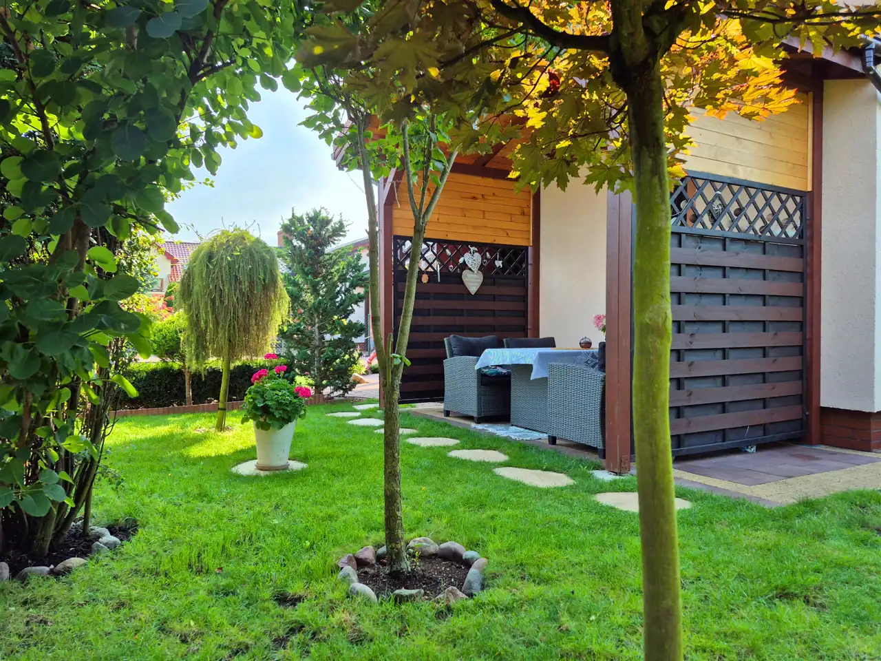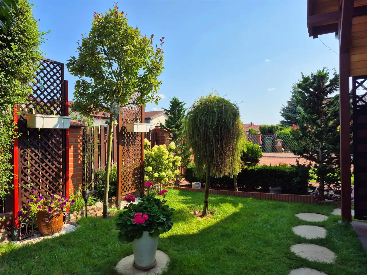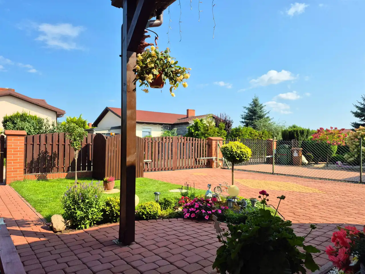 Podjazd i teren wokół domu wyłożony kostką brukową. Brama wjazdowa automatycznie otwierana przy pomocy pilota. W ogrodzie piękne drzewa i różne nasadzenia, taras i zadaszona altanka. Nieruchomość gruntowa o powierzchni ok. 455m2.