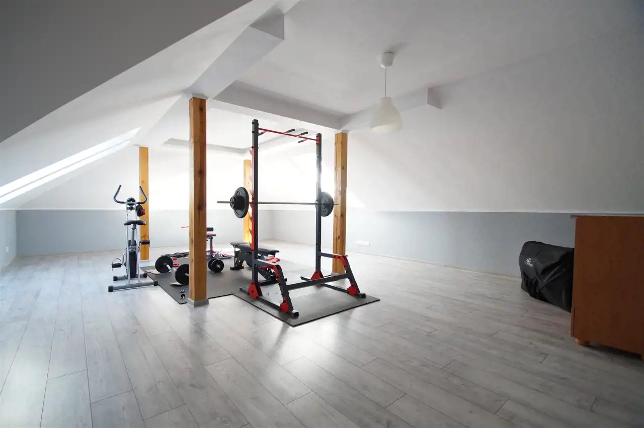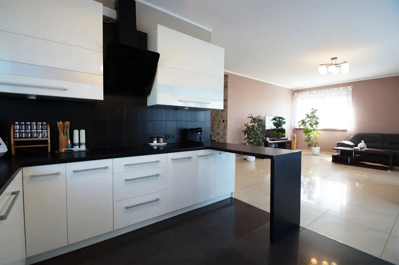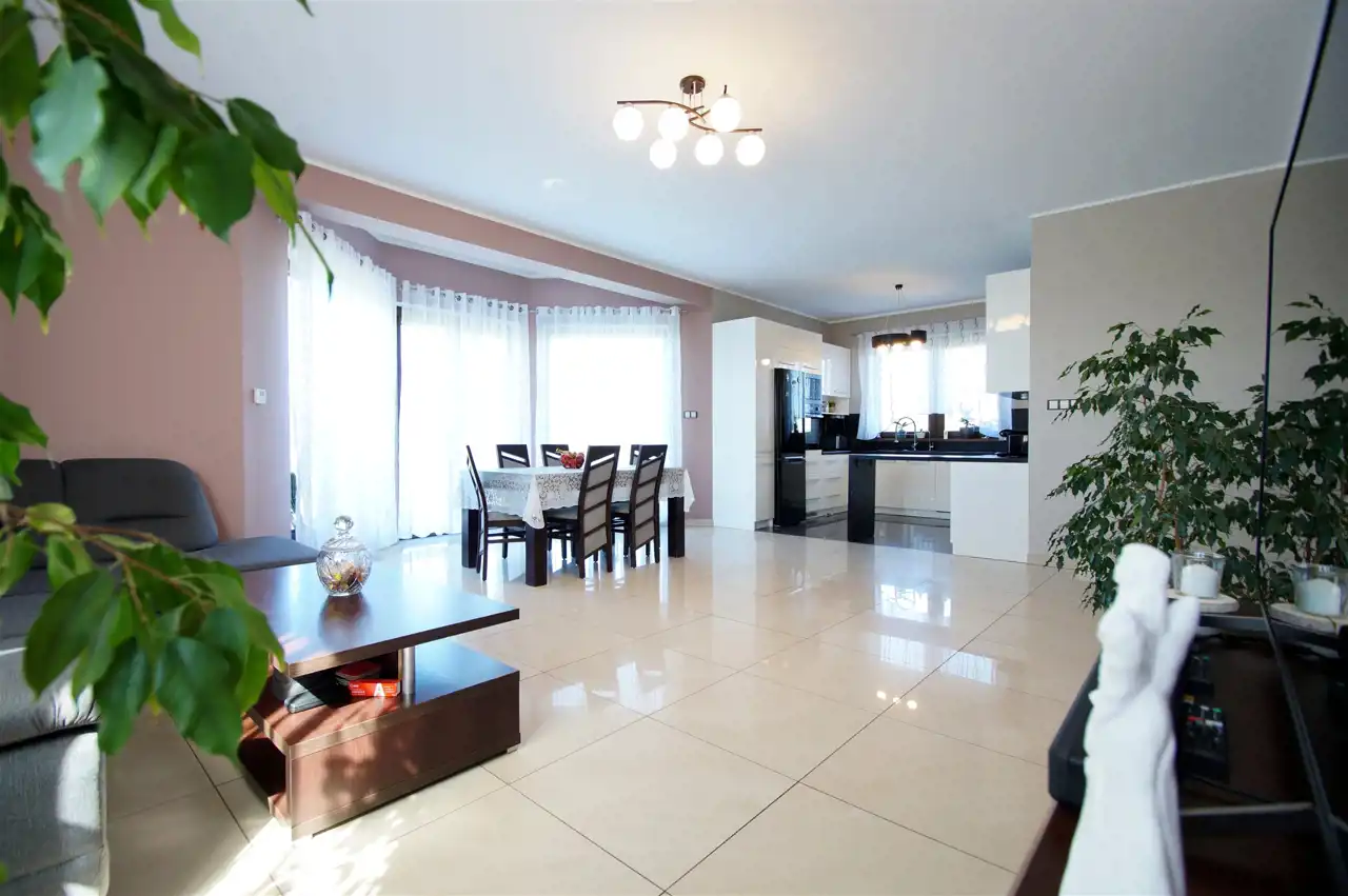 Nowoczesna zabudowa kuchenna z wysokiej klasy sprzętem AGD, instalacja ogrzewania podłogowego rozprowadzona przez całą powierzchnię użytkową, w każdym pomieszczeniu termostat do ustawienia temperatury, centralny odkurzacz, stacja uzdatniania wody, garaż wyłożony płytkami, videodomofon.