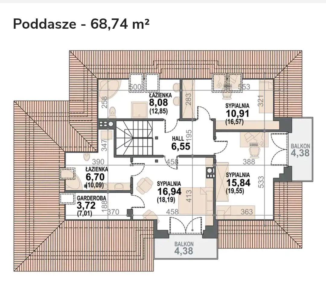 Na poddaszu znajdują się trzy funkcjonalne sypialnie( jedna z własną garderobą i łazienką), dwie łazienki, garderoba i przedpokój. Z dwóch pokoi wyjście na balkony.
