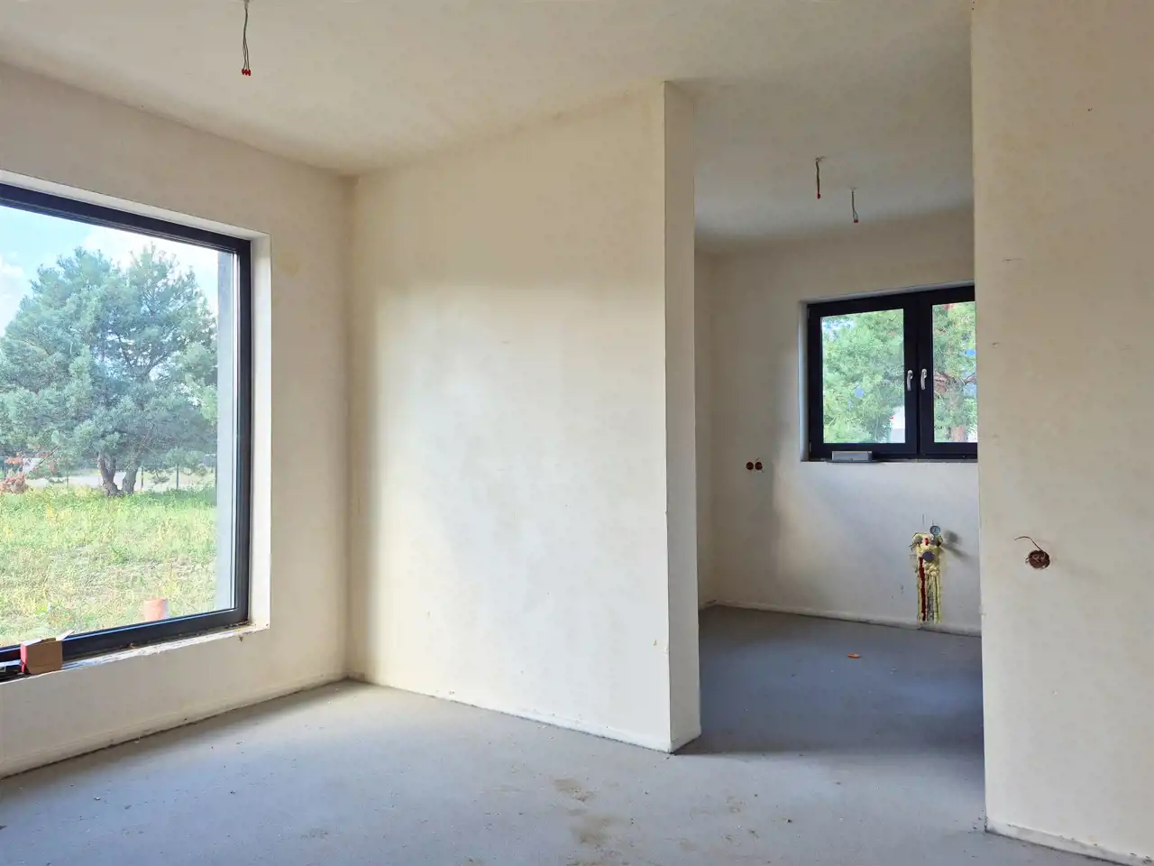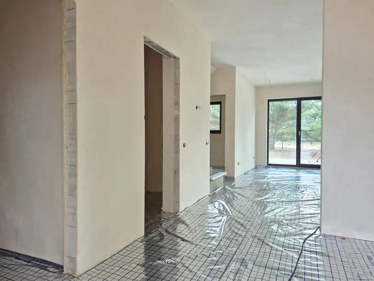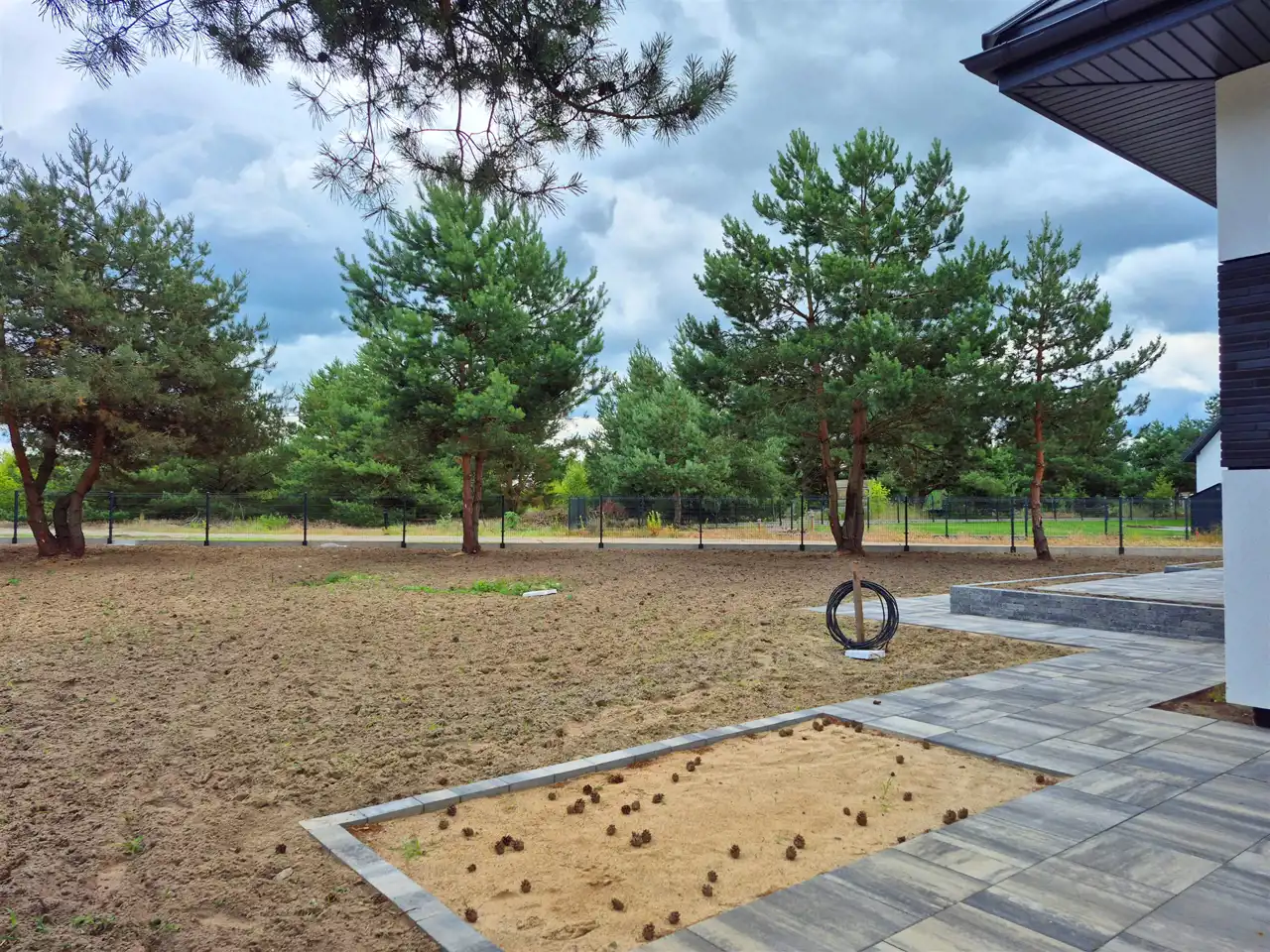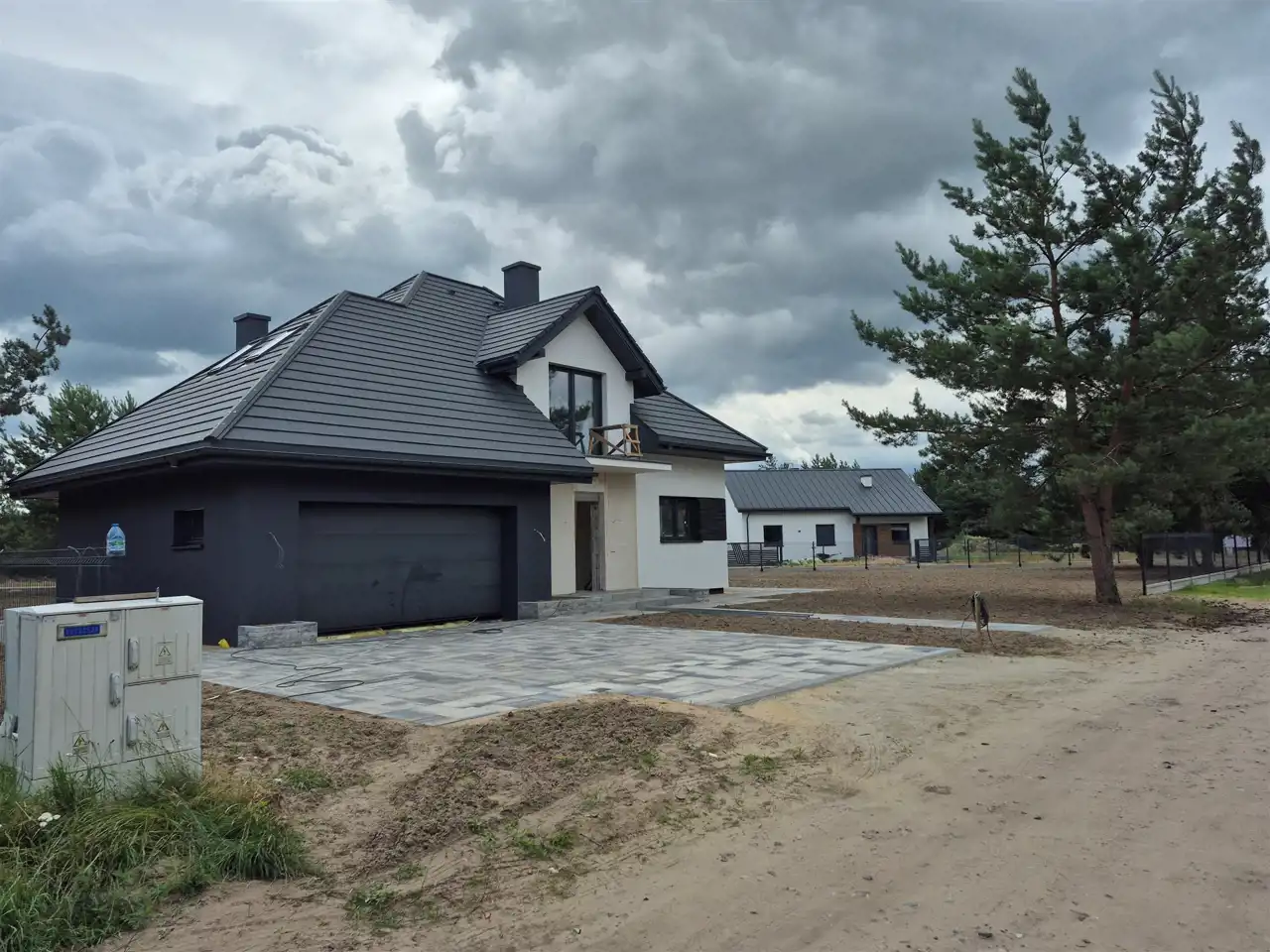 Do budynku doprowadzono wszystkie niezbędne media tj. instalację energetyczną, wodną, kanalizacyjną (przydomowa oczyszczalnia). Dachówka Krispol, okna trzyszybowe, rolety zewnętrzne, ściany ocieplone styropianem 20cm, poddasze piana pur 20 cm. Ogrzewanie przy pomocy pompy ciepła, w salonie wyprowadzona instalacja do kominka. W całym budynku rozprowadzono instalację ogrzewania podłogowego. Dom usytuowany jest na działce o powierzchni ok 1300m2 na której pozostały leśne nasadzenia. Całość ogrodzona z trzech stron, przed budynkiem i na tarasie wyłożona kostka i unikatowe donice. W ogrodzie ziemia przygotowana do przyjęcia nasadzeń.