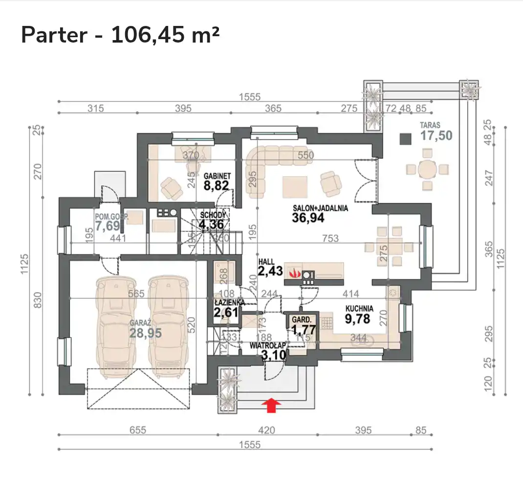 - salon z jadalnią 36,94m2 z wyjściem na taras 17,50m2