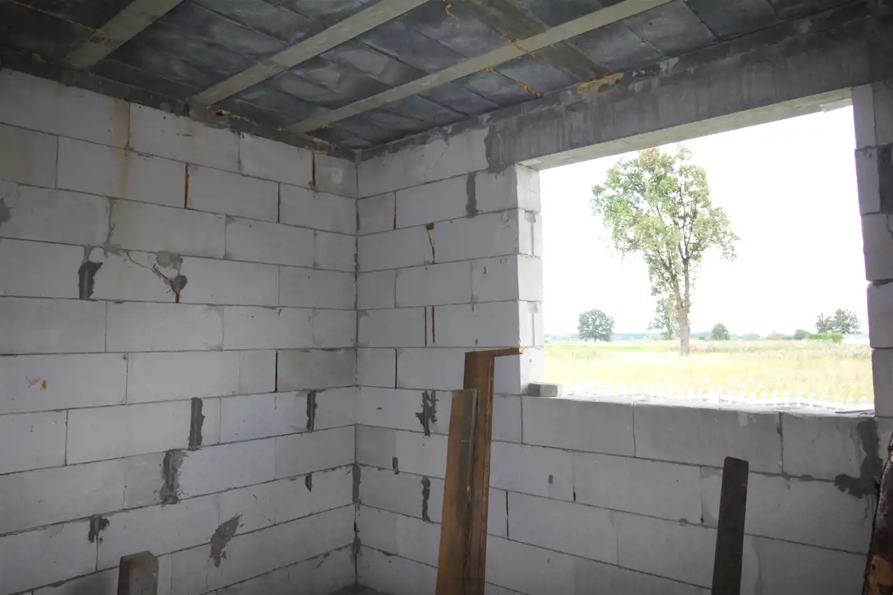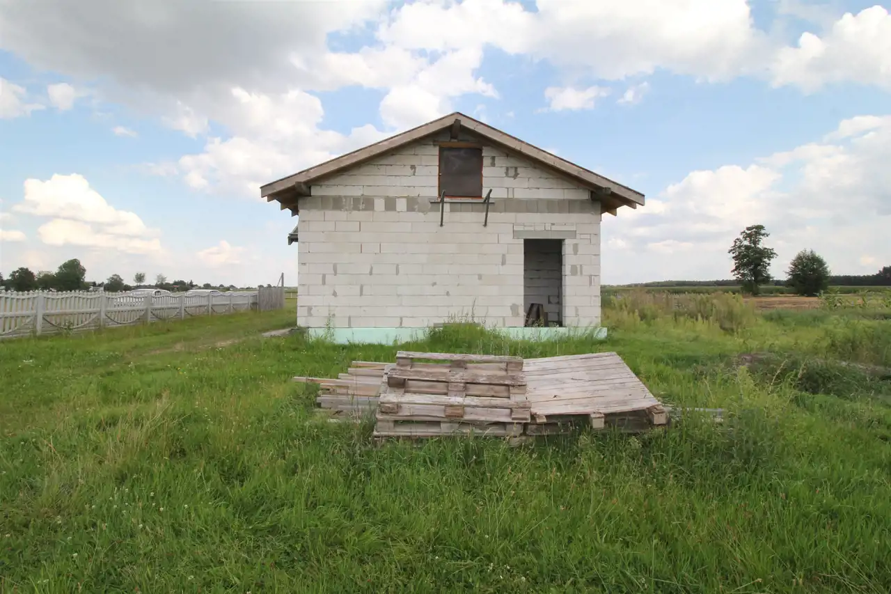 Działka o pow. 940 m2 zabudowana wolnostojącym budynkiem w stanie surowym otwartym o pow. 61,53 m2 składającym się z następujących pomieszczeń:
