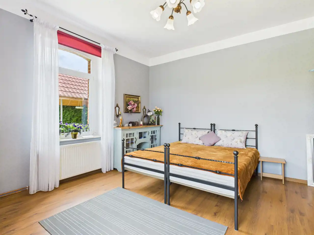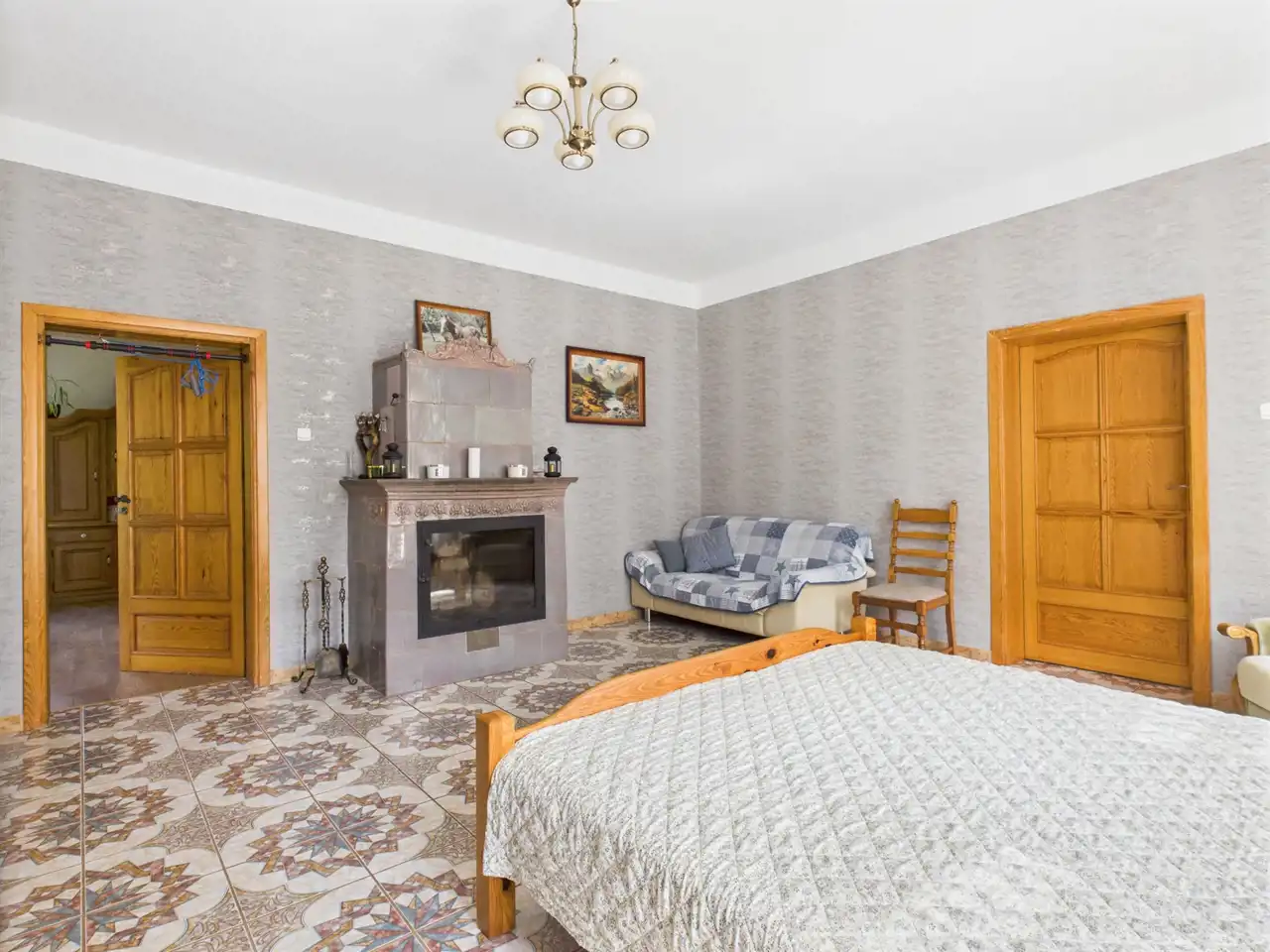 Okna PCV, drewniane drzwi wewnętrzne, kominek w sypialni – elementy dodające ciepła i klimatu.
