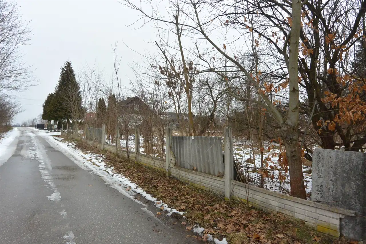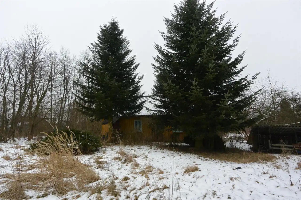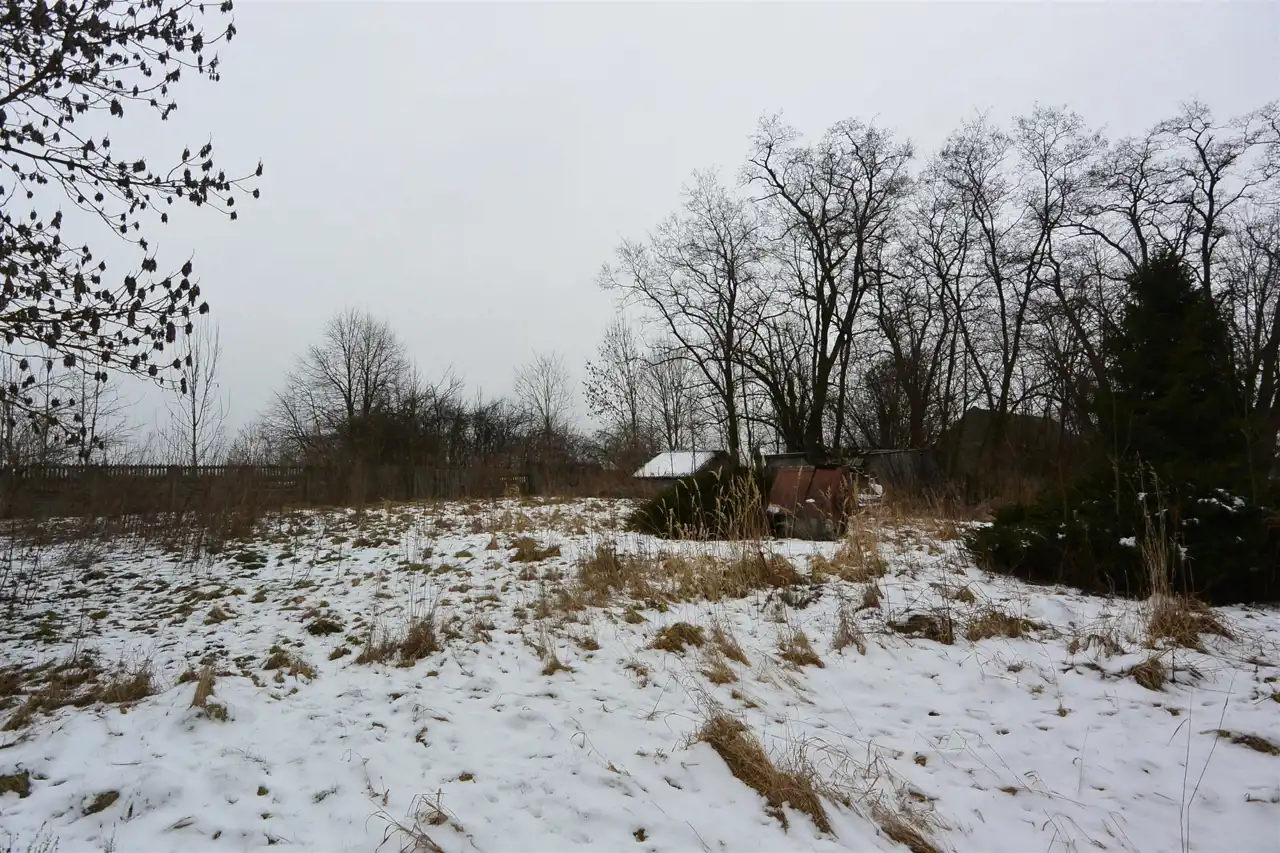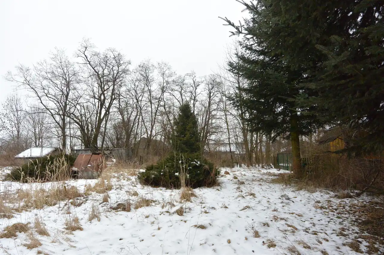 The property is situated in the first line from the road, with direct access to an asphalt municipal road. The plot has access from two sides. Nearby properties are developed. The land is flat, covered with trees and shrubs (partially requiring clearing), and includes an old residential house and farm buildings dating back to the 1930s, intended for demolition.