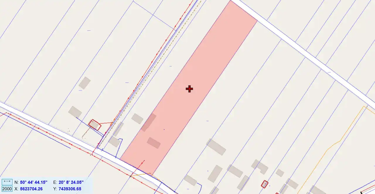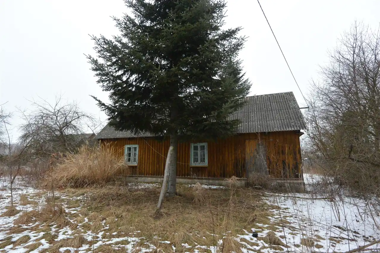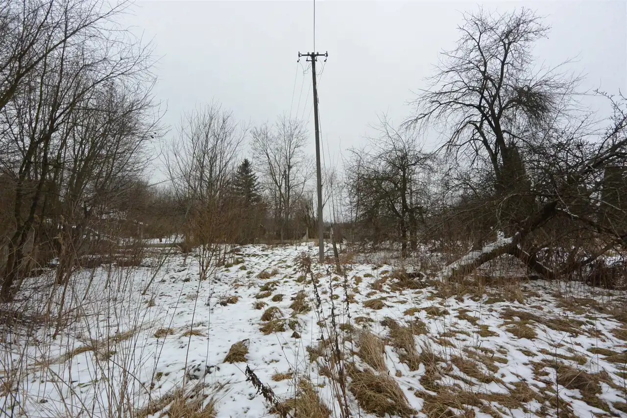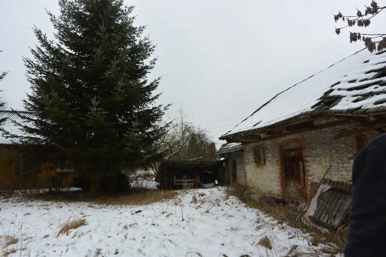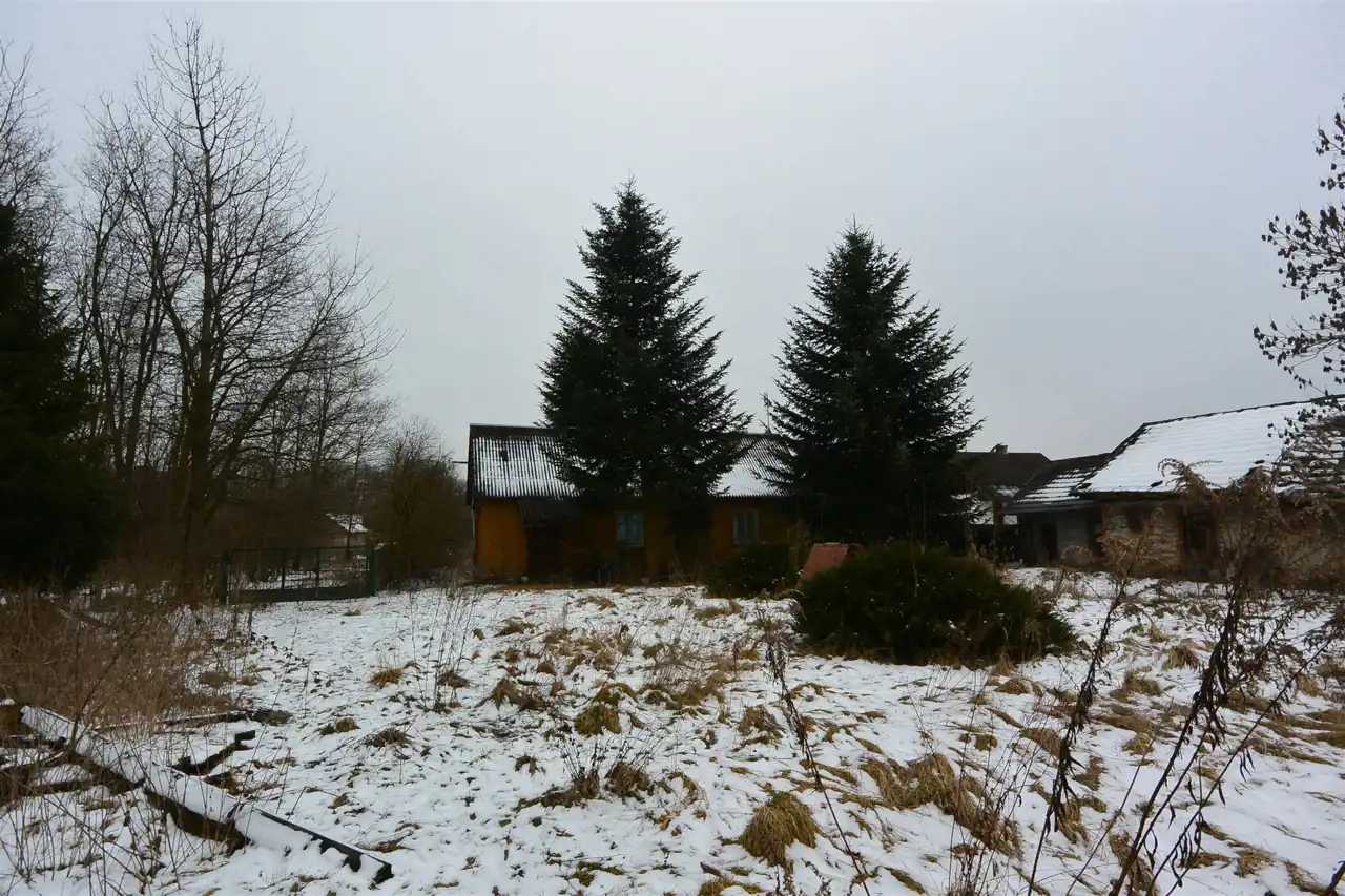 The property is situated in the first line from the road, with direct access to an asphalt municipal road. The plot has access from two sides. Nearby properties are developed. The land is flat, covered with trees and shrubs (partially requiring clearing), and includes an old residential house and farm buildings dating back to the 1930s, intended for demolition.