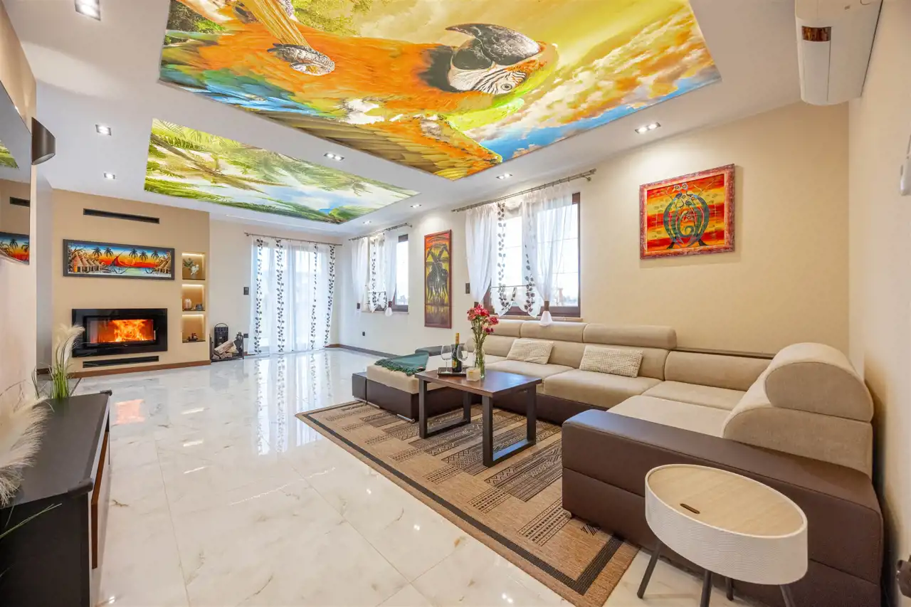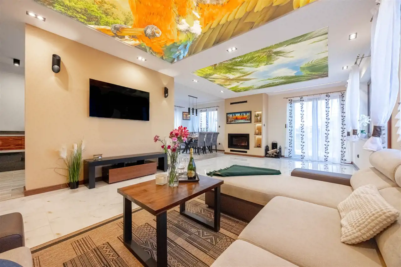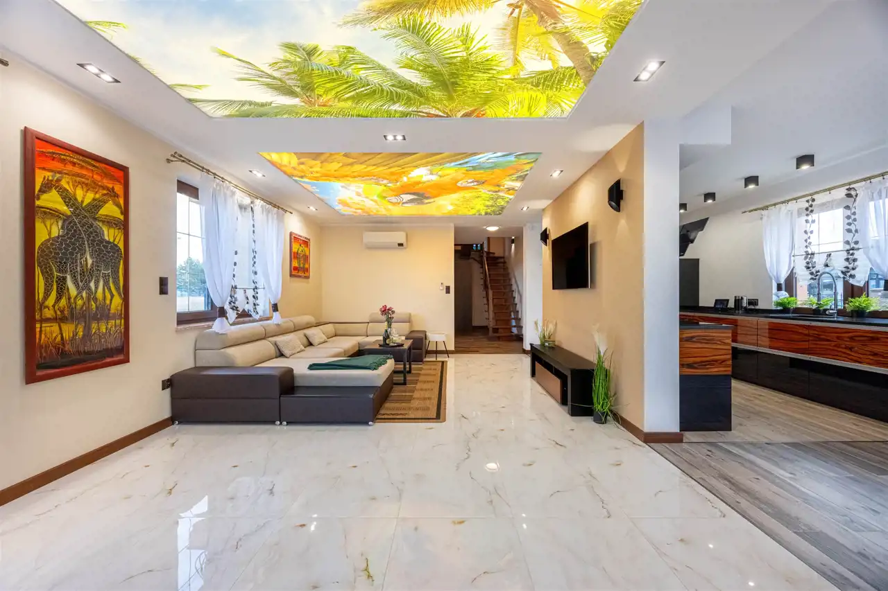 - nowoczesne sufity napinane z grafiką i podświetleniem LED w salonie – unikalny element dekoracyjny. (UWAGA! łatwy bezinwazyjny demontaż lub możliwość zmiany aranżacji grafik)