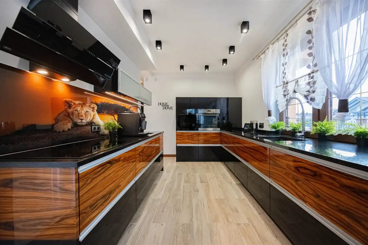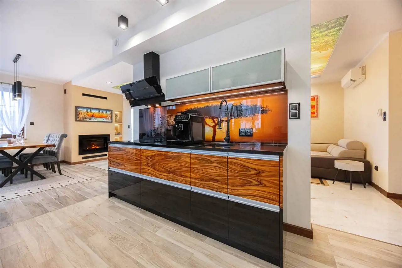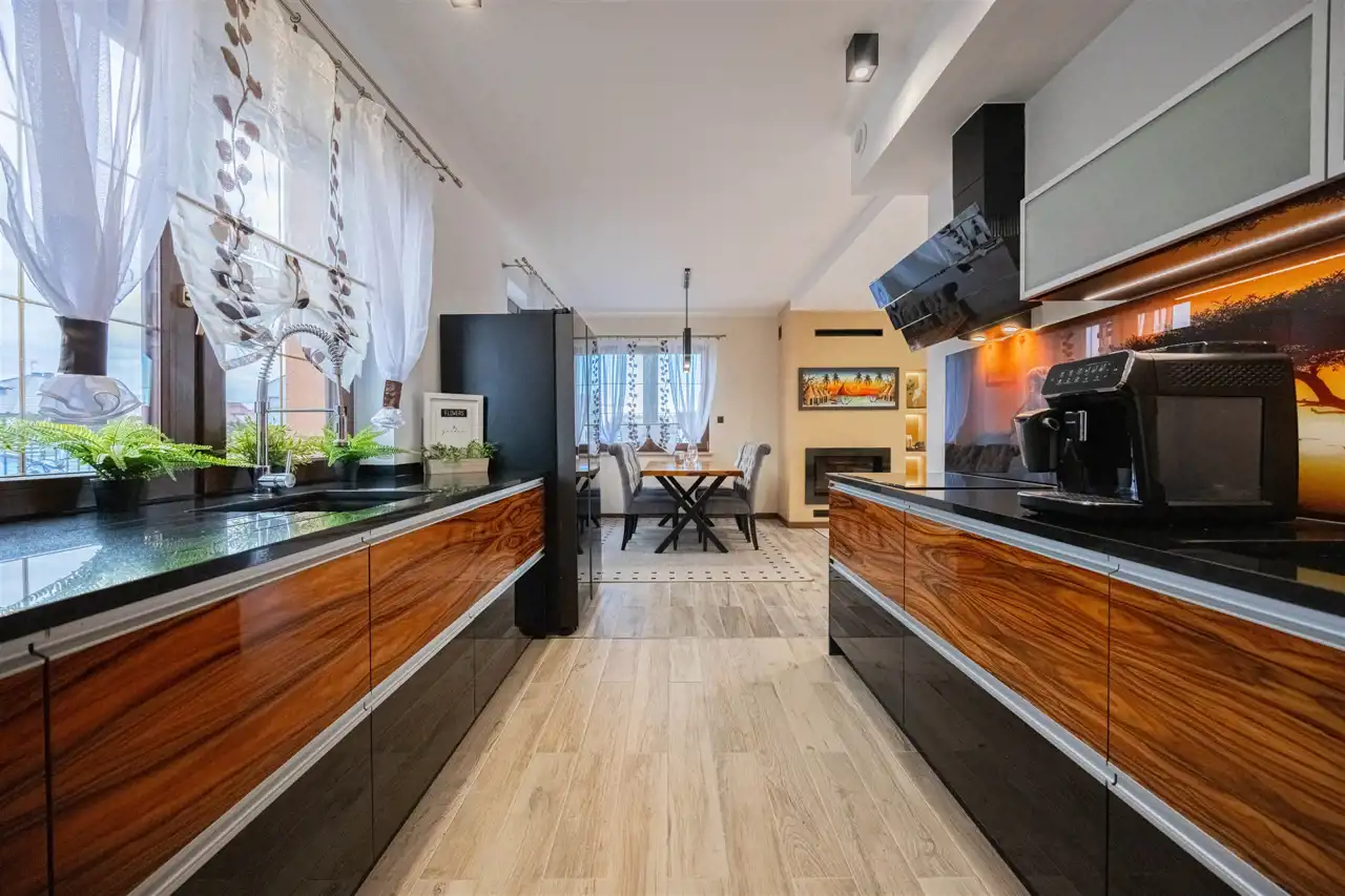 - kuchnia wyposażona w granitowy blat (3 cm), dwa zlewy, dwa piekarniki oraz meble wykończone ekskluzywną okleiną z drzewa palisandru.